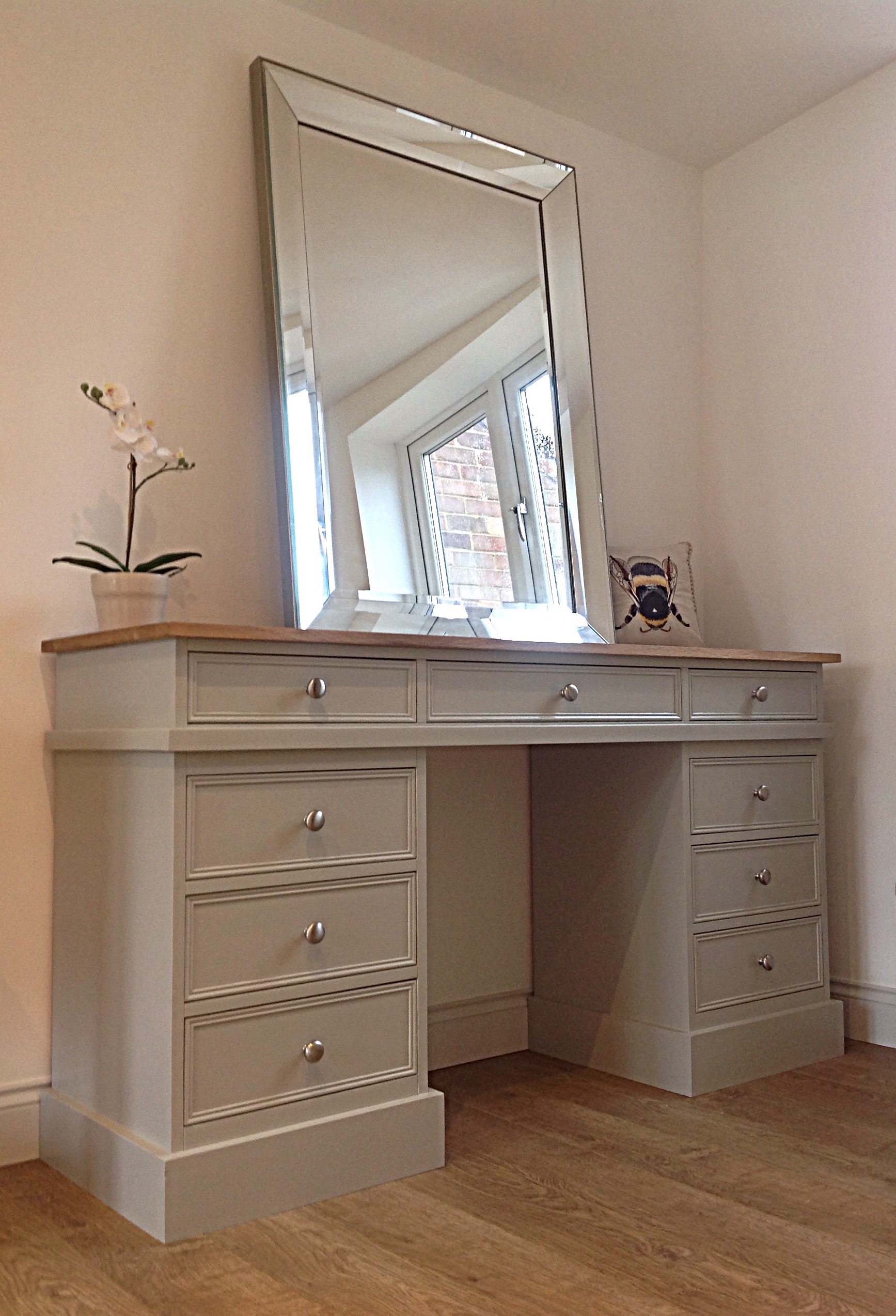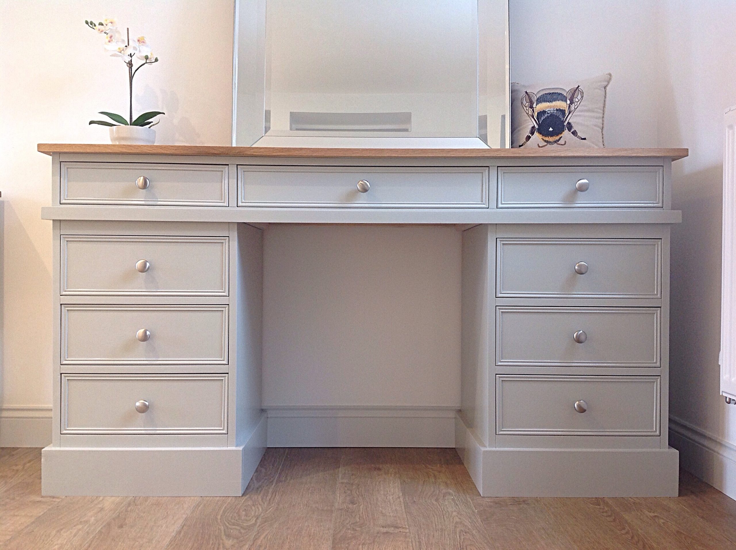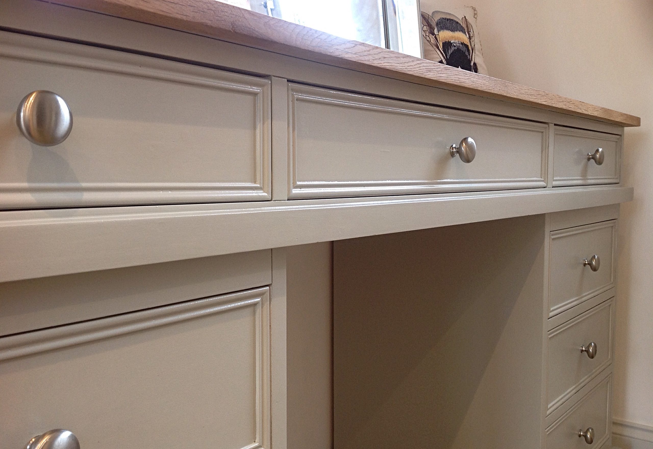 A STYLE THAT’S COMPLETELY TIMELESS, OUR NEW DESIGN OF DRESSING TABLE COMES WITH A SOLID OAK OILED WORKTOP, PAINTED IN ANY SHADE FROM THE BEAUTIFUL, FARROW AND BALL RANGE AND WITH LOVELY BRUSHED CHROME ROUND HANDLES. DESIGNED INITIALLY AS A DRESSING TABLE BUT IS VERSATILE ENOUGH TO USE AS A STUNNING AND CLASSIC DESK. THE REST OF THE UNIT IS MADE OF SOLID PINE USING TRADITIONAL AND TRUSTED JOINERY TECHNIQUES, ALL OUR DRAWERS HAVE DOVETAIL JOINTS.