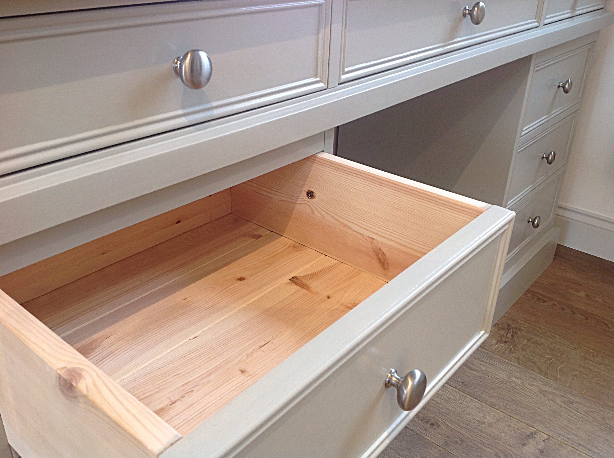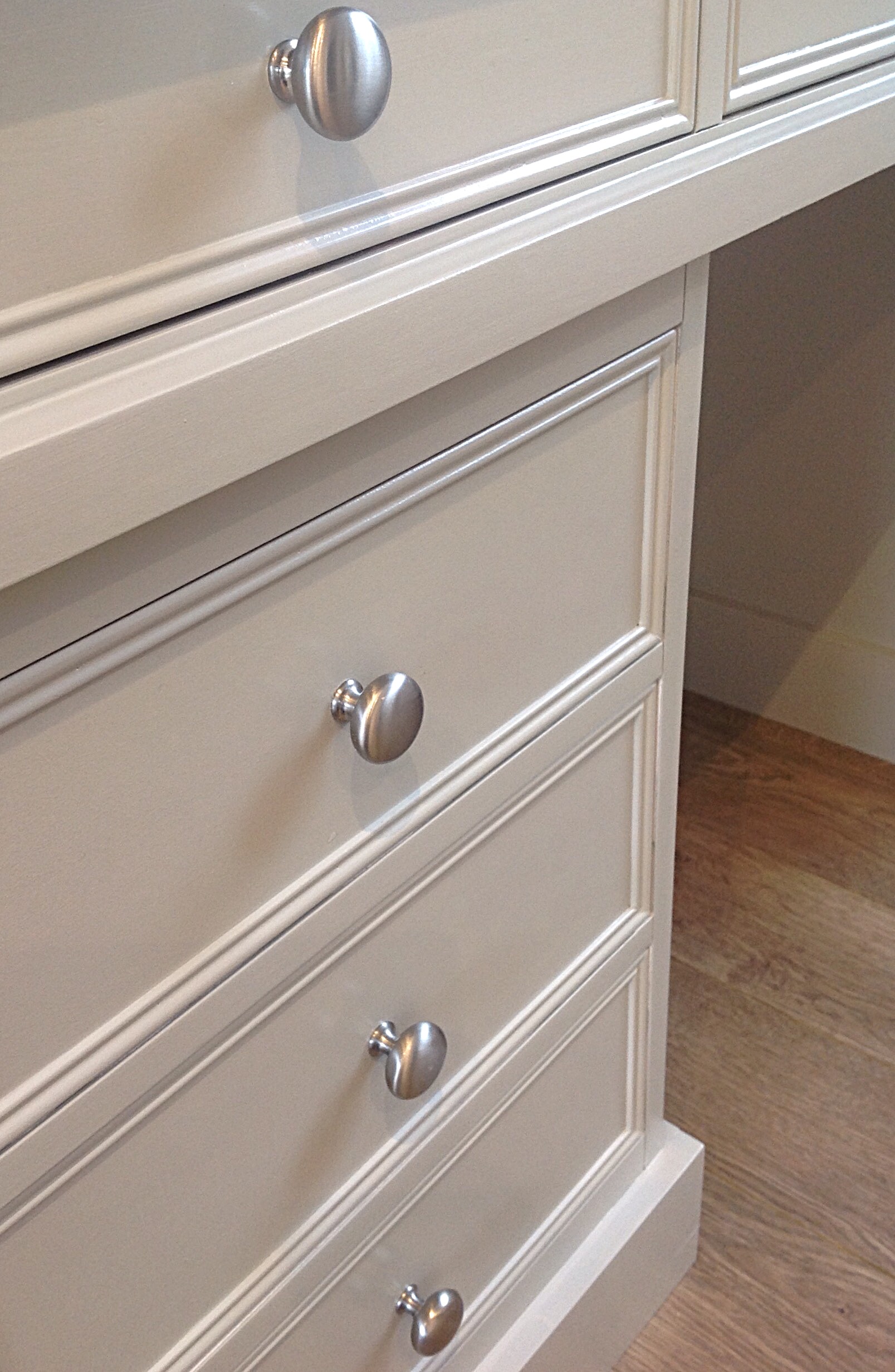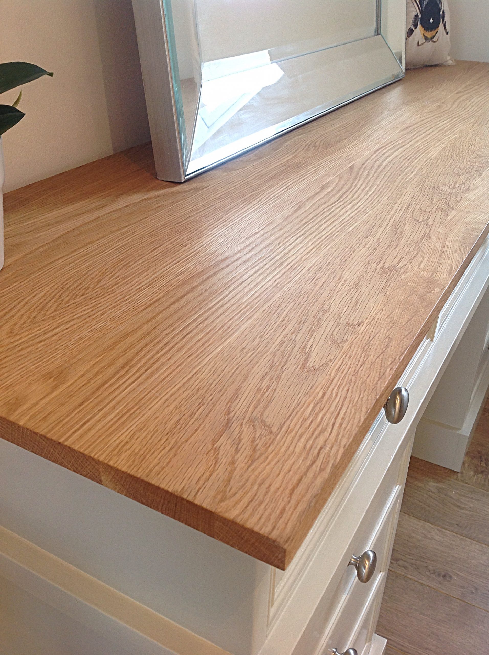 A STYLE THAT’S COMPLETELY TIMELESS, OUR NEW DESIGN OF DRESSING TABLE COMES WITH A SOLID OAK OILED WORKTOP, PAINTED IN ANY SHADE FROM THE BEAUTIFUL, FARROW AND BALL RANGE AND WITH LOVELY BRUSHED CHROME ROUND HANDLES. DESIGNED INITIALLY AS A DRESSING TABLE BUT IS VERSATILE ENOUGH TO USE AS A STUNNING AND CLASSIC DESK. THE REST OF THE UNIT IS MADE OF SOLID PINE USING TRADITIONAL AND TRUSTED JOINERY TECHNIQUES, ALL OUR DRAWERS HAVE DOVETAIL JOINTS.