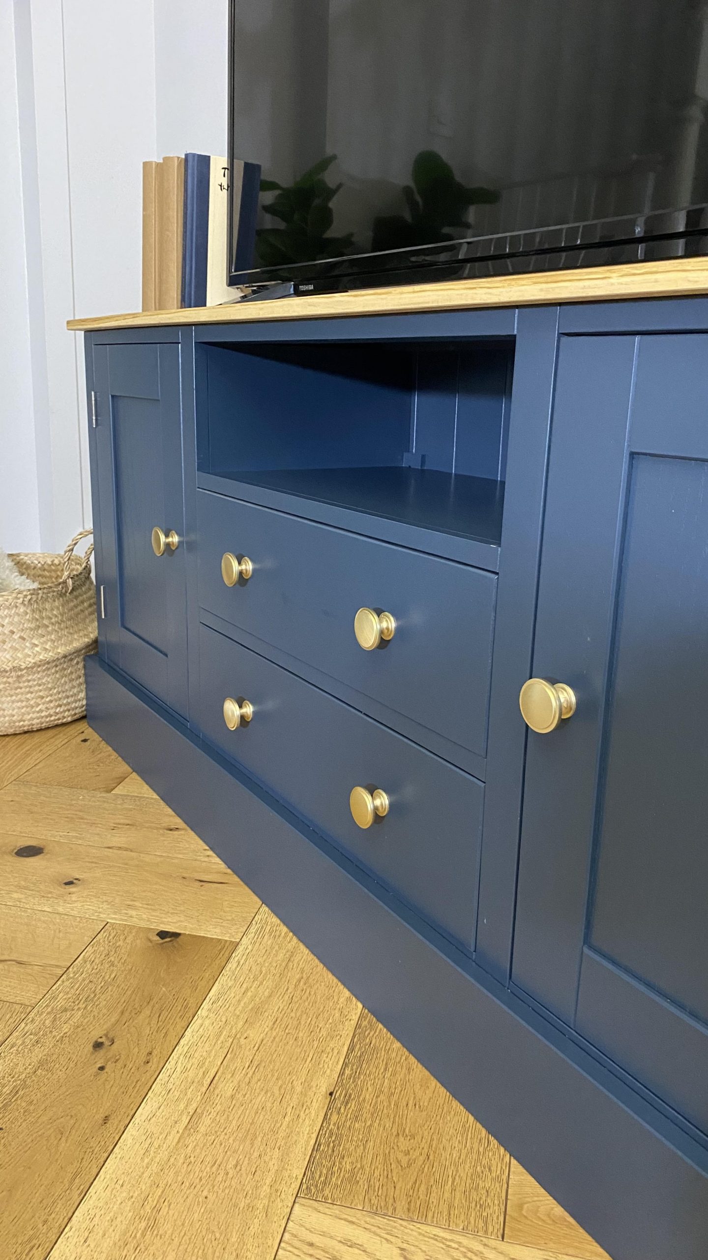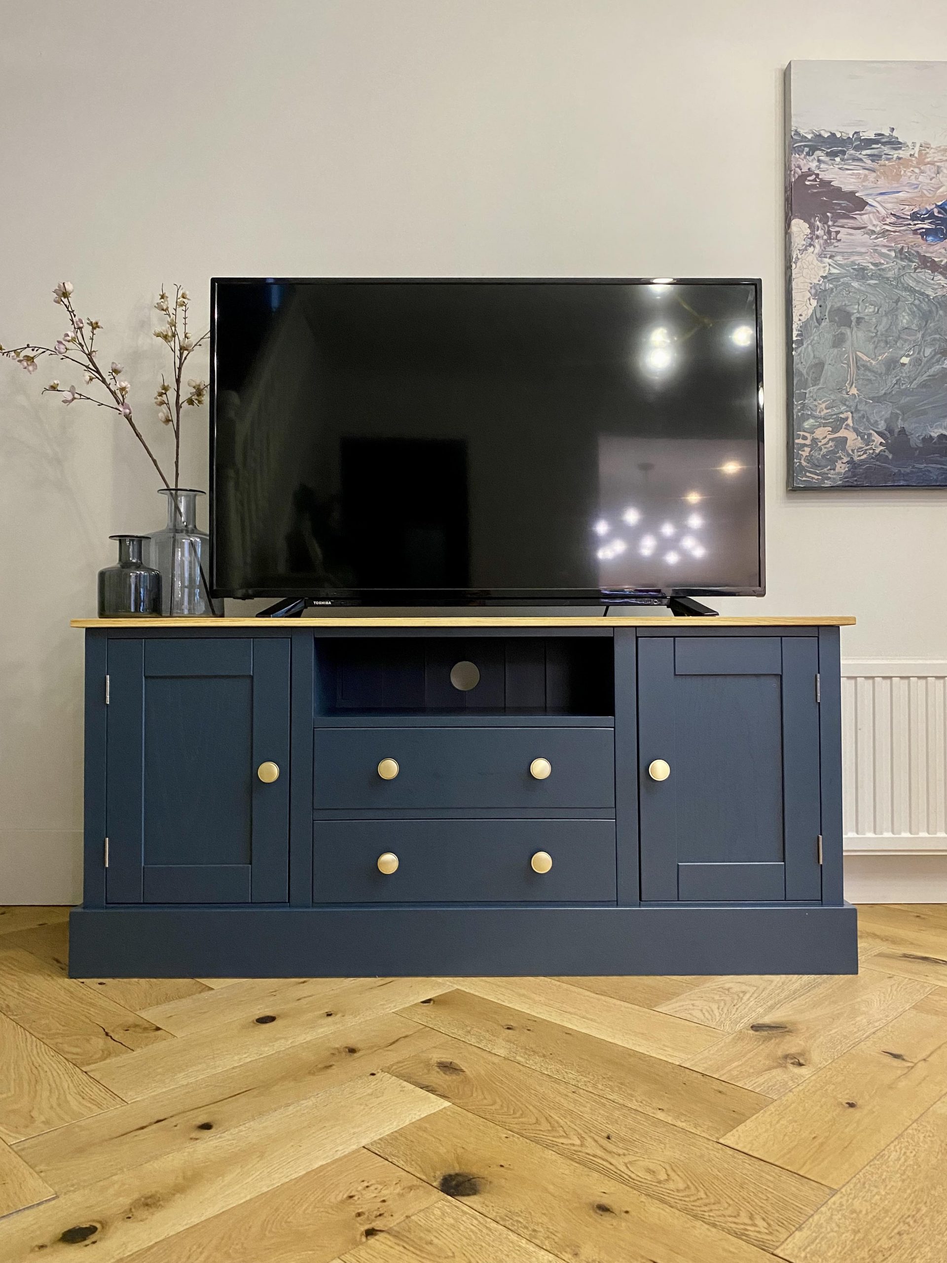 Made in the UK by skilled cabinet makers, this TV cabinet offers space for all your media equipment and features a solid oak worktop. The design has symmetrical proportions and a classic style. The unit can be painted in any Farrow & Ball colour, included in the price. It is made of solid pine with an oak worktop, or you can choose a painted worktop or waxed pine. Different handle finishes can also be selected if brushed gold is not right for you. A smooth backboard is now used as standard, with the option to choose a tongue-and-groove backboard if preferred.