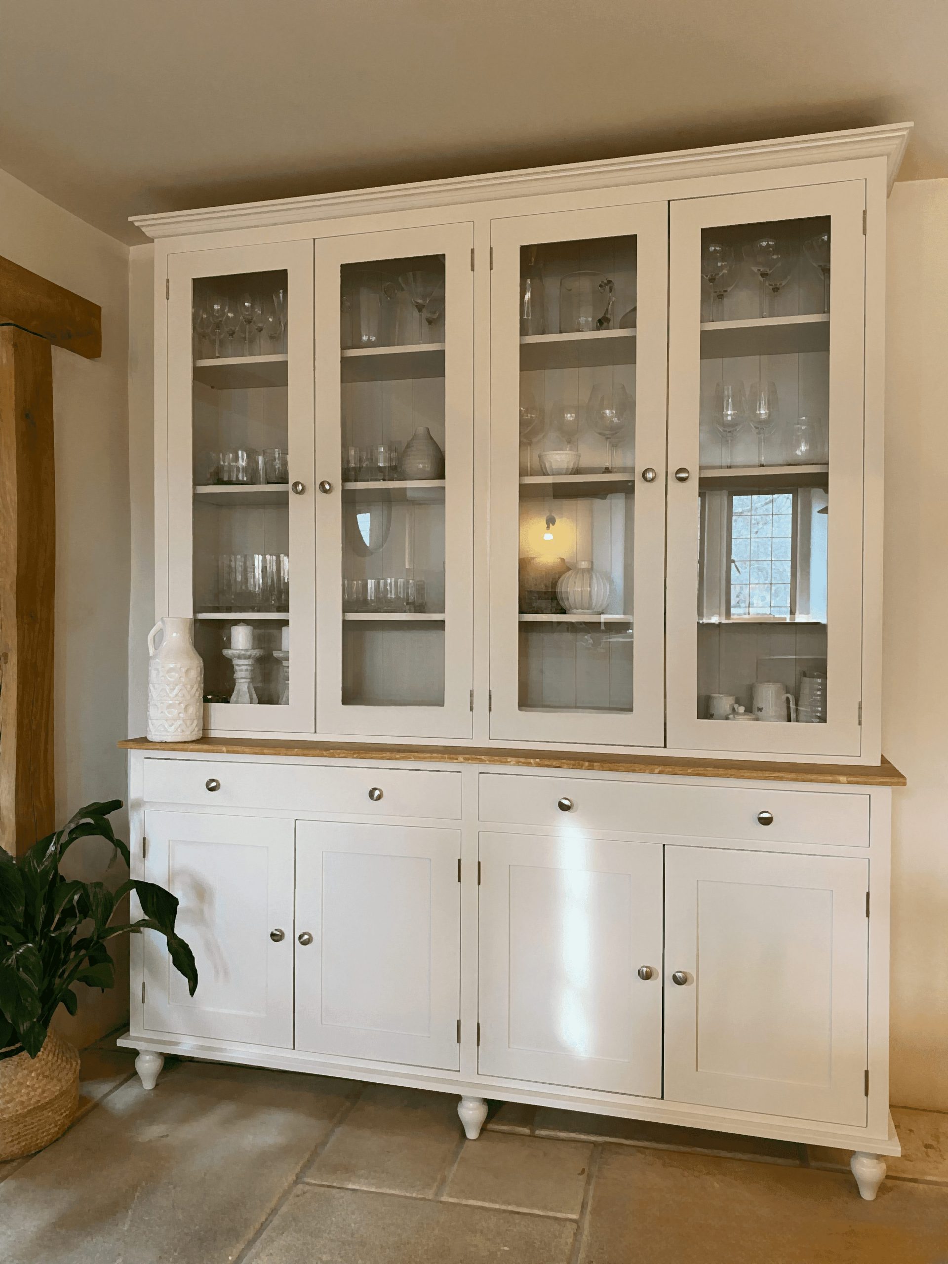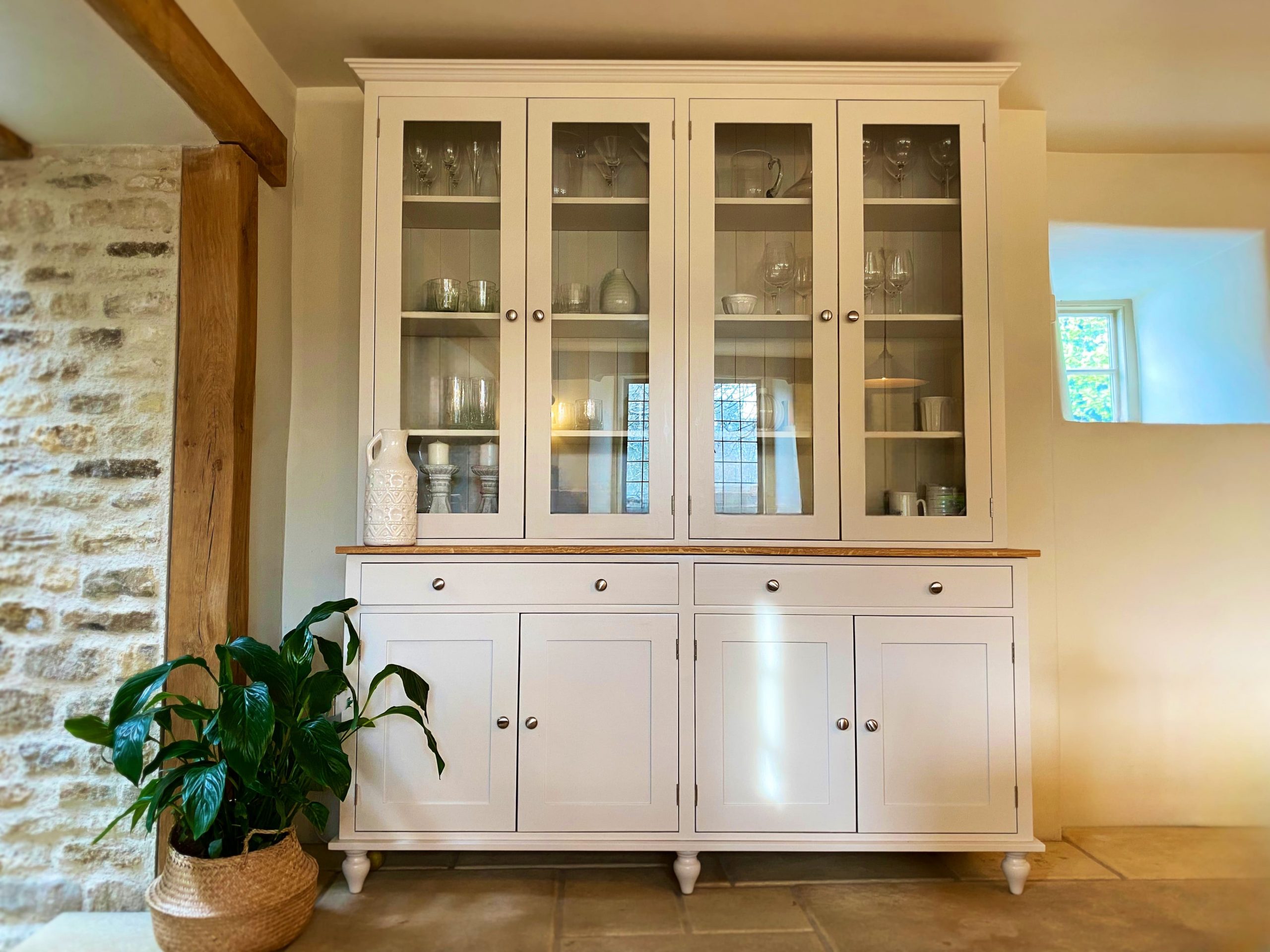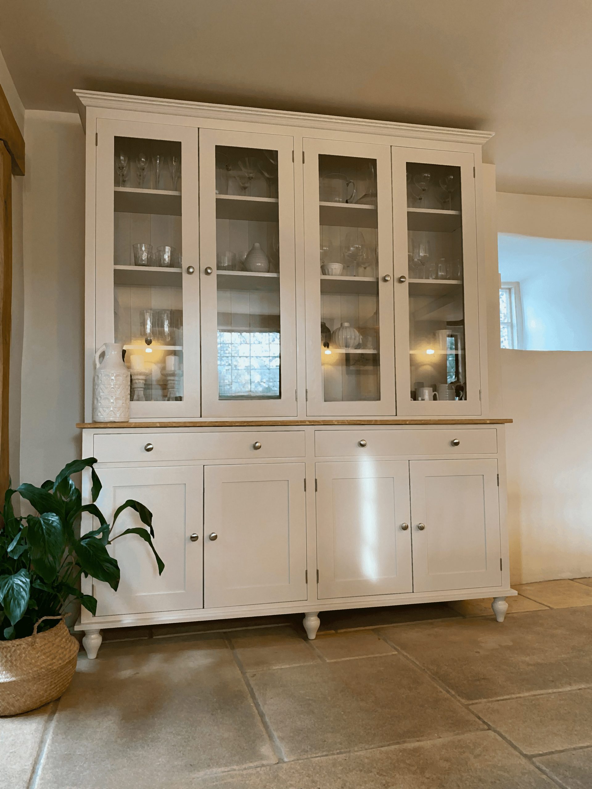 PART OF OUR ODELL RANGE, THIS CALM, STYLISH WELSH DRESSER COMES WITH A SOLID OAK WORKTOP. THE BEAUTIFUL BLONDE TONES IN THE OAK SETS OFF MOST COLOUR PALETTE’S PERFECTLY. CHOOSE FROM ANY FARROW AND BALL COLOUR, YOU CAN ALSO CHOOSE THE EVER POPULAR PAINTED WORKTOP OR THE WAXED PINE WORKTOP.
