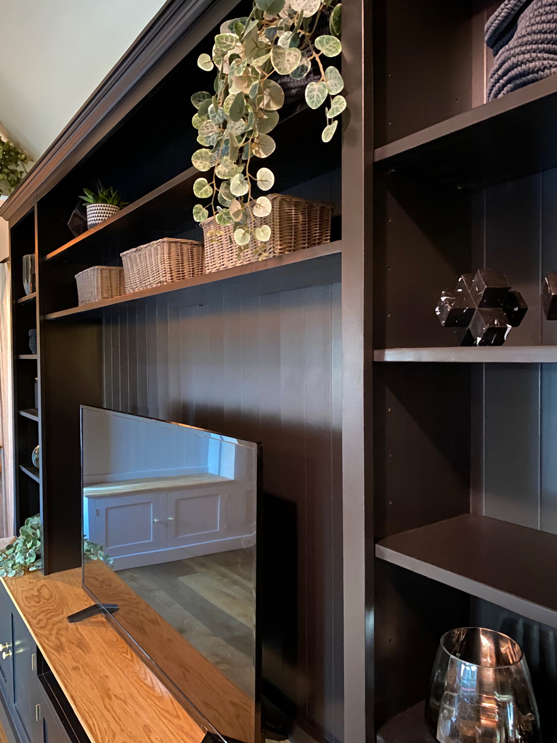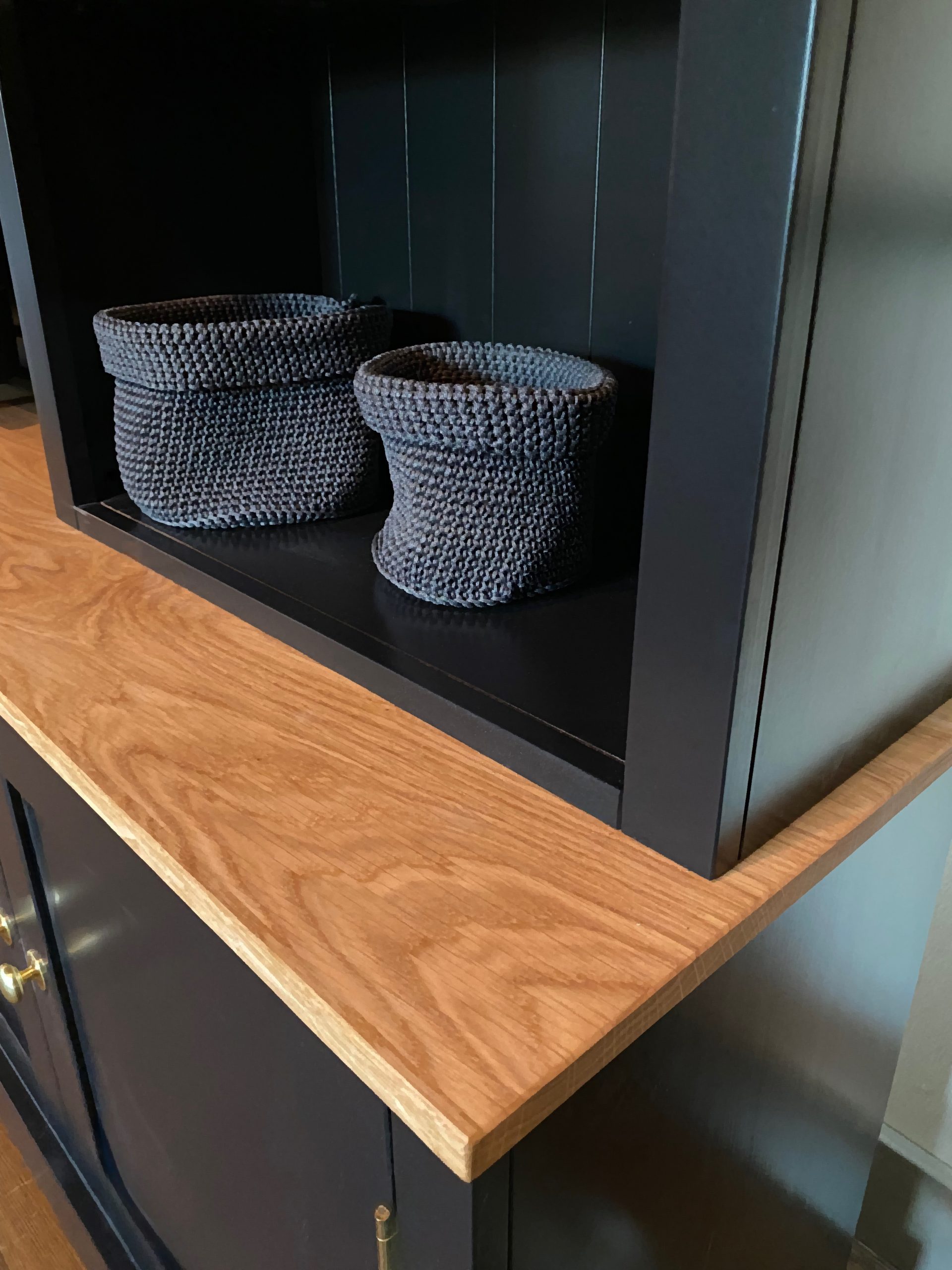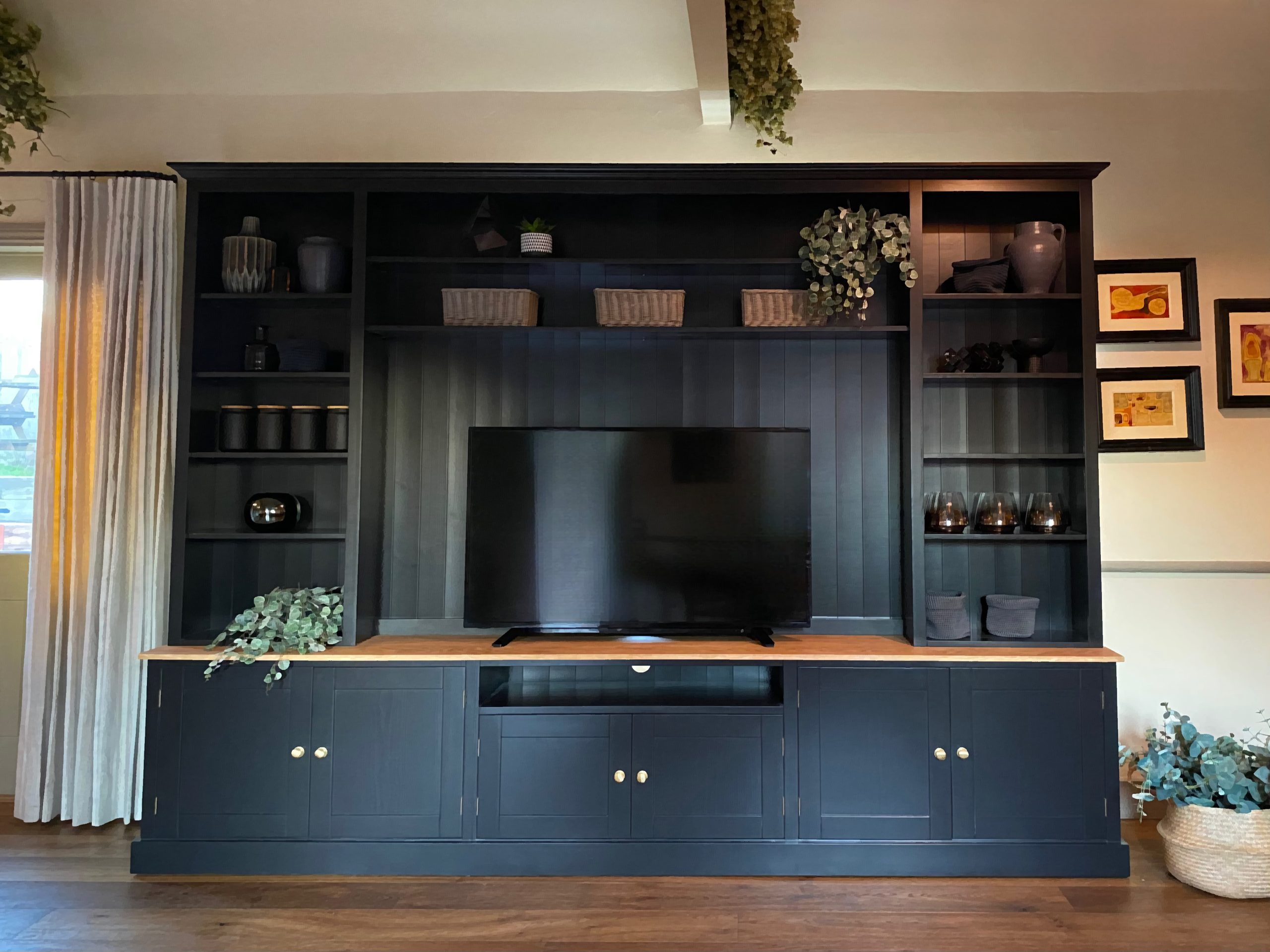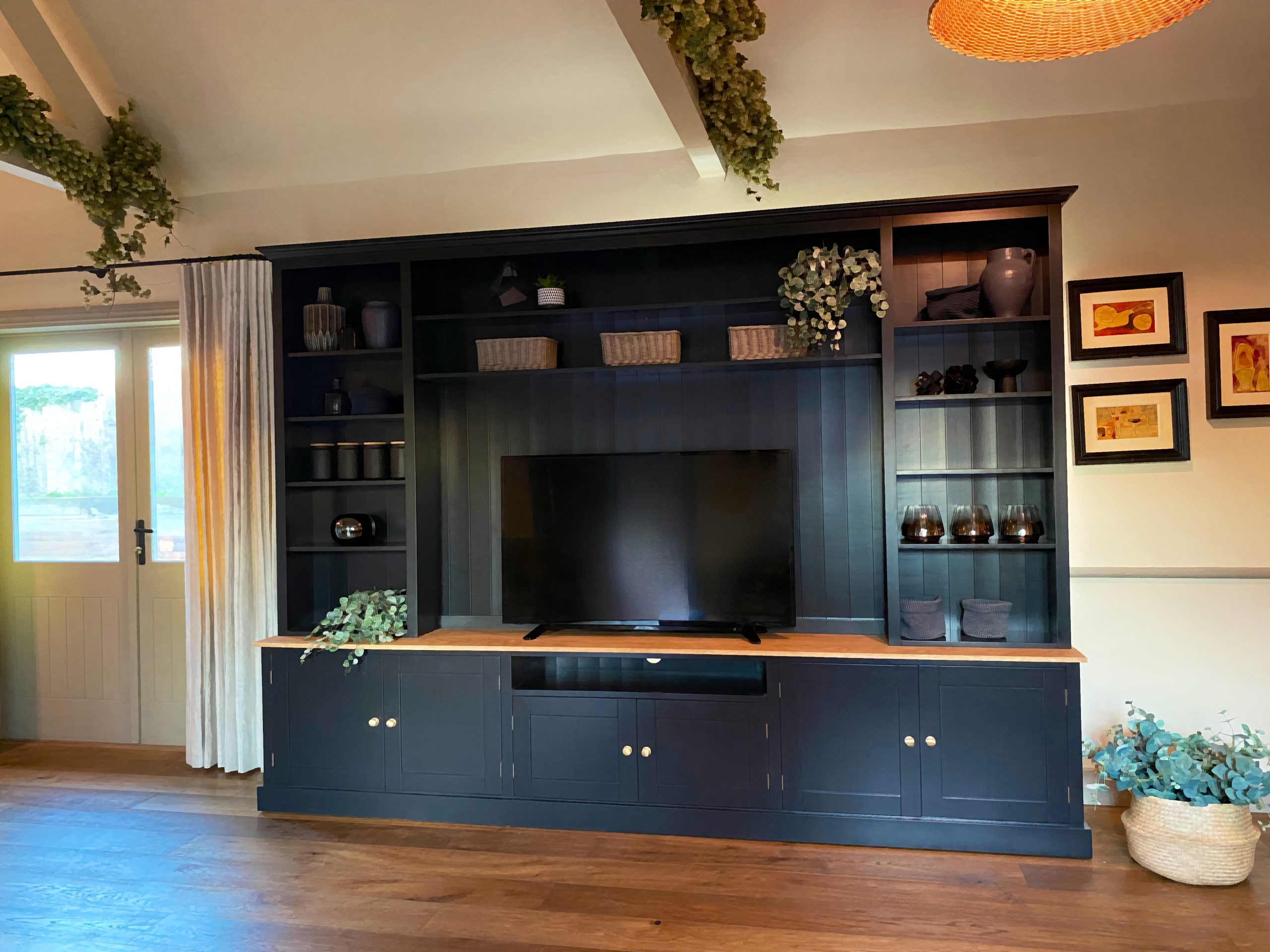 This huge full wall media unit is a real statement piece and offers a large amount of practical storage. It features a contemporary yet subtle style, housing your TV neatly and symmetrically. The unit is painted in any Farrow & Ball colour of your choice, allowing it to suit any interior or colour scheme. All furniture is handmade in the UK by skilled craftsmen, and the unit can be made to any size. If you love this design but need it slightly smaller or larger, it can be made to your requirements. Cable holes are included as standard in the TV area, with the centre of the cable hole positioned 20cm up from the worktop and centred within the TV space. The unit now comes with a smooth backboard as standard, with the option to choose a tongue-and-groove backboard if preferred.