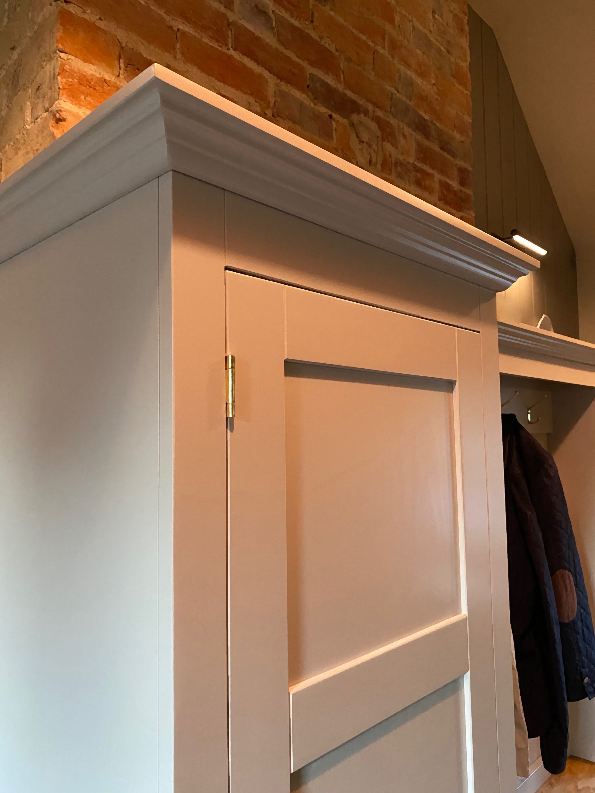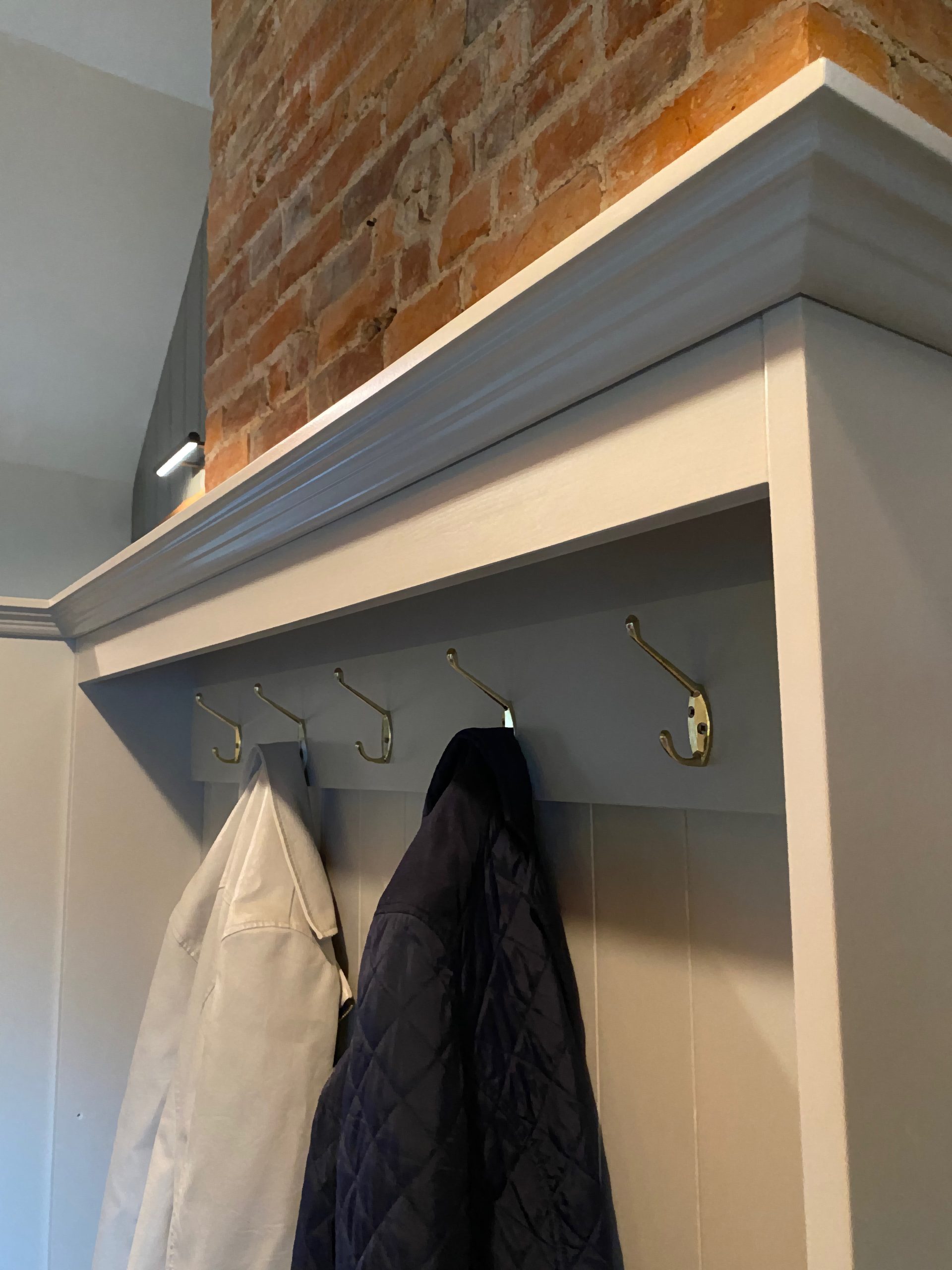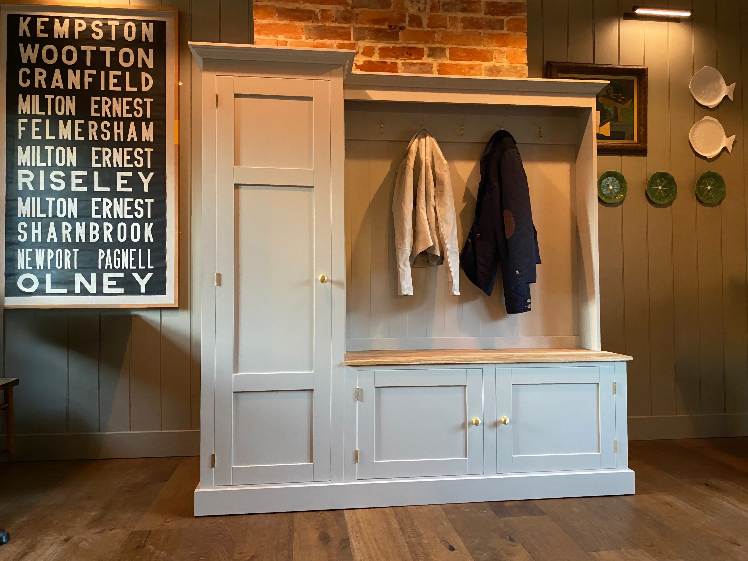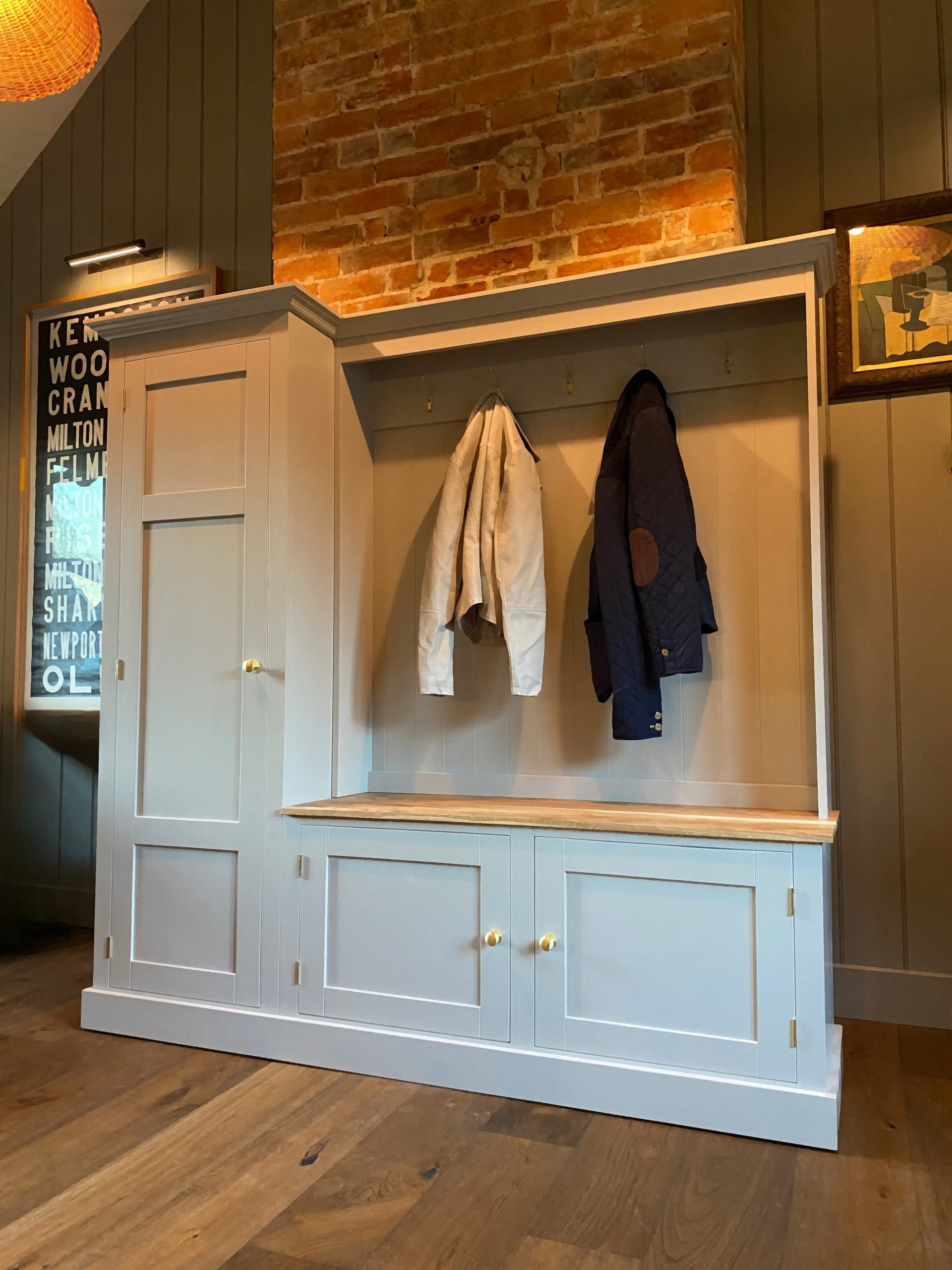 Highly practical, well proportioned and on trend, this boot room unit is gorgeous. Handmade in the UK by passionate cabinet makers who use time-honoured techniques to build these mud room units. With a good size bench and cupboard below to store wellies, shoes and coat hooks above. To the side is a cupboard with shelves but if you’d rather a hanging rail or more hooks then let us know,