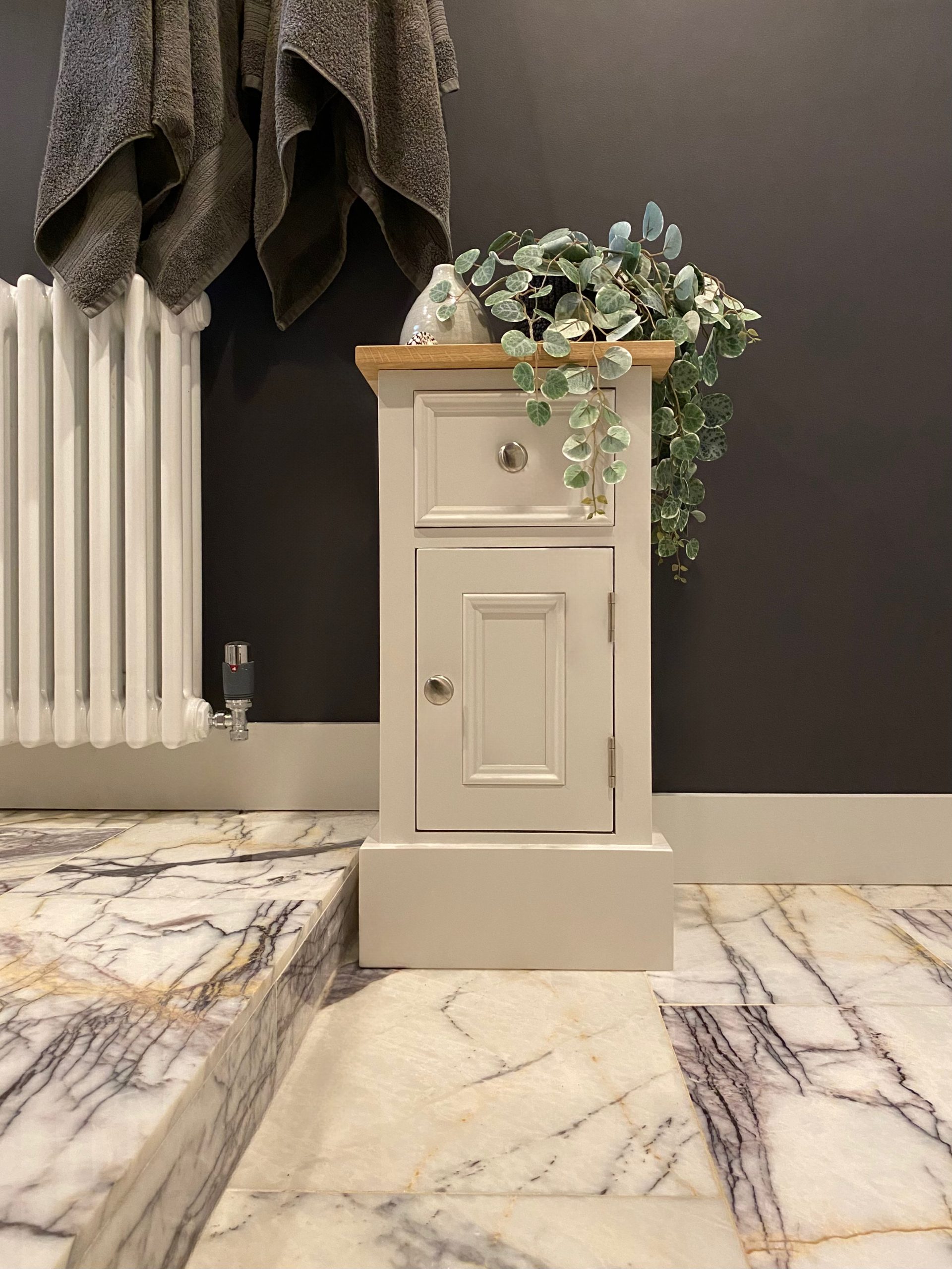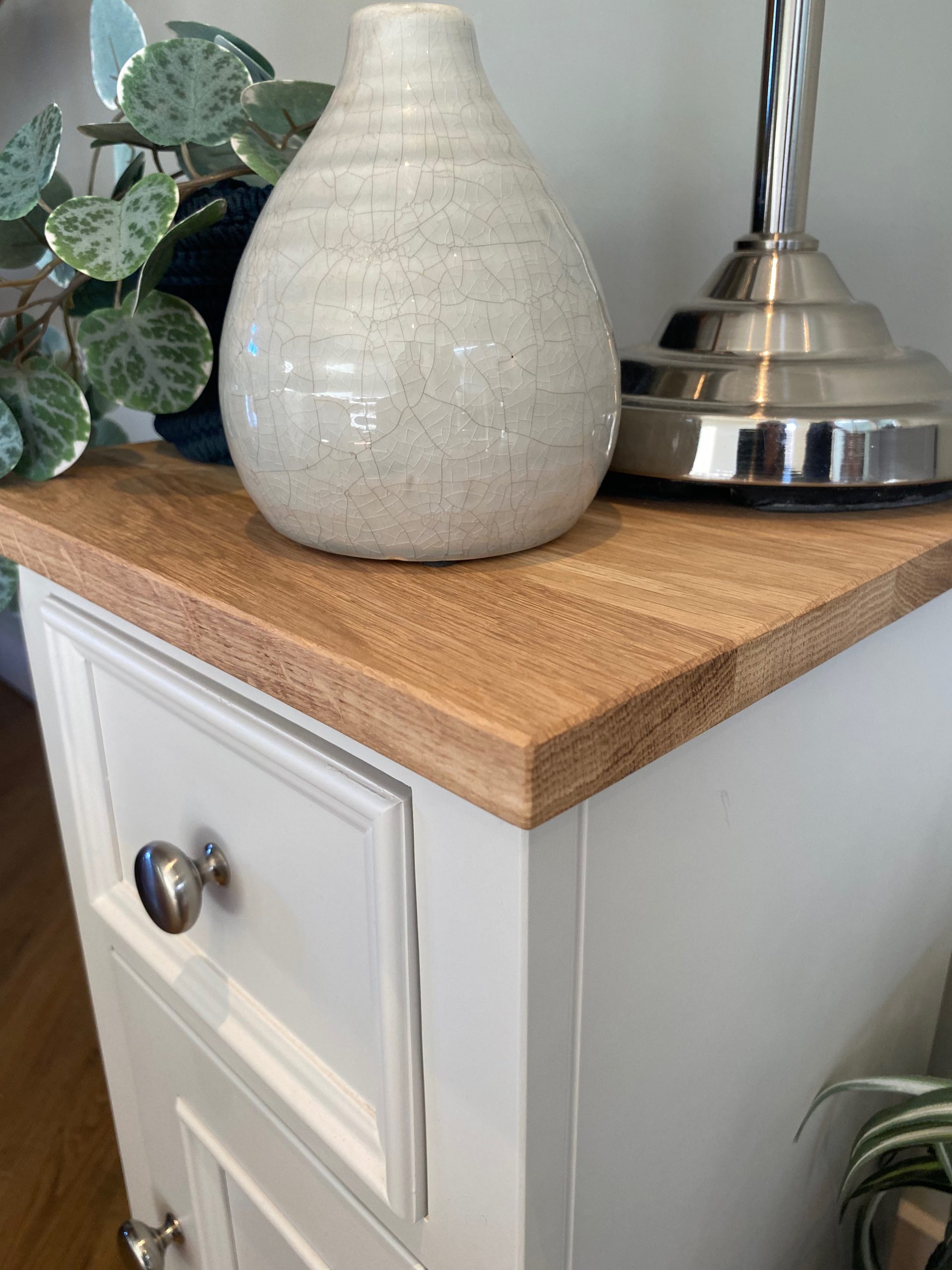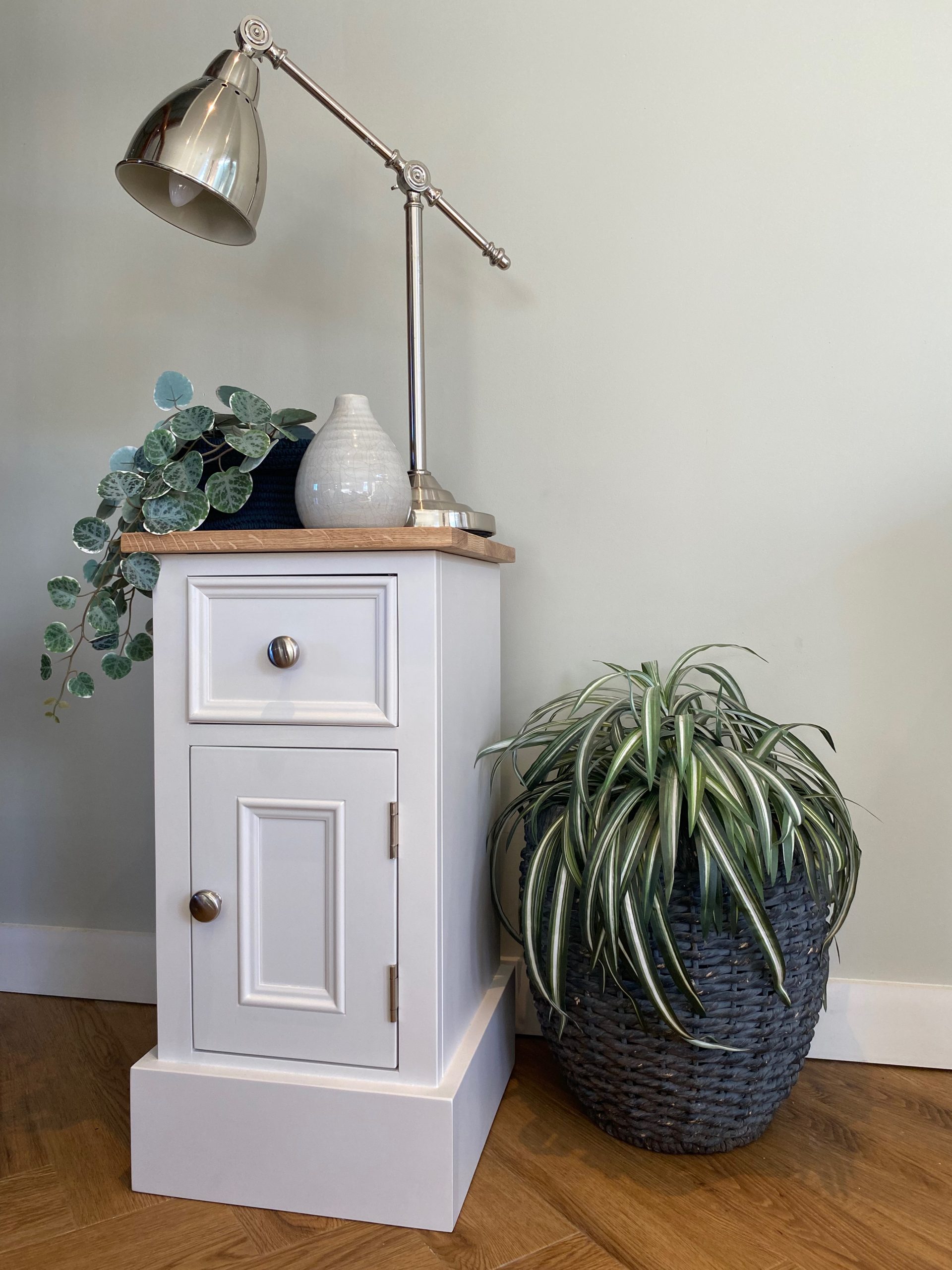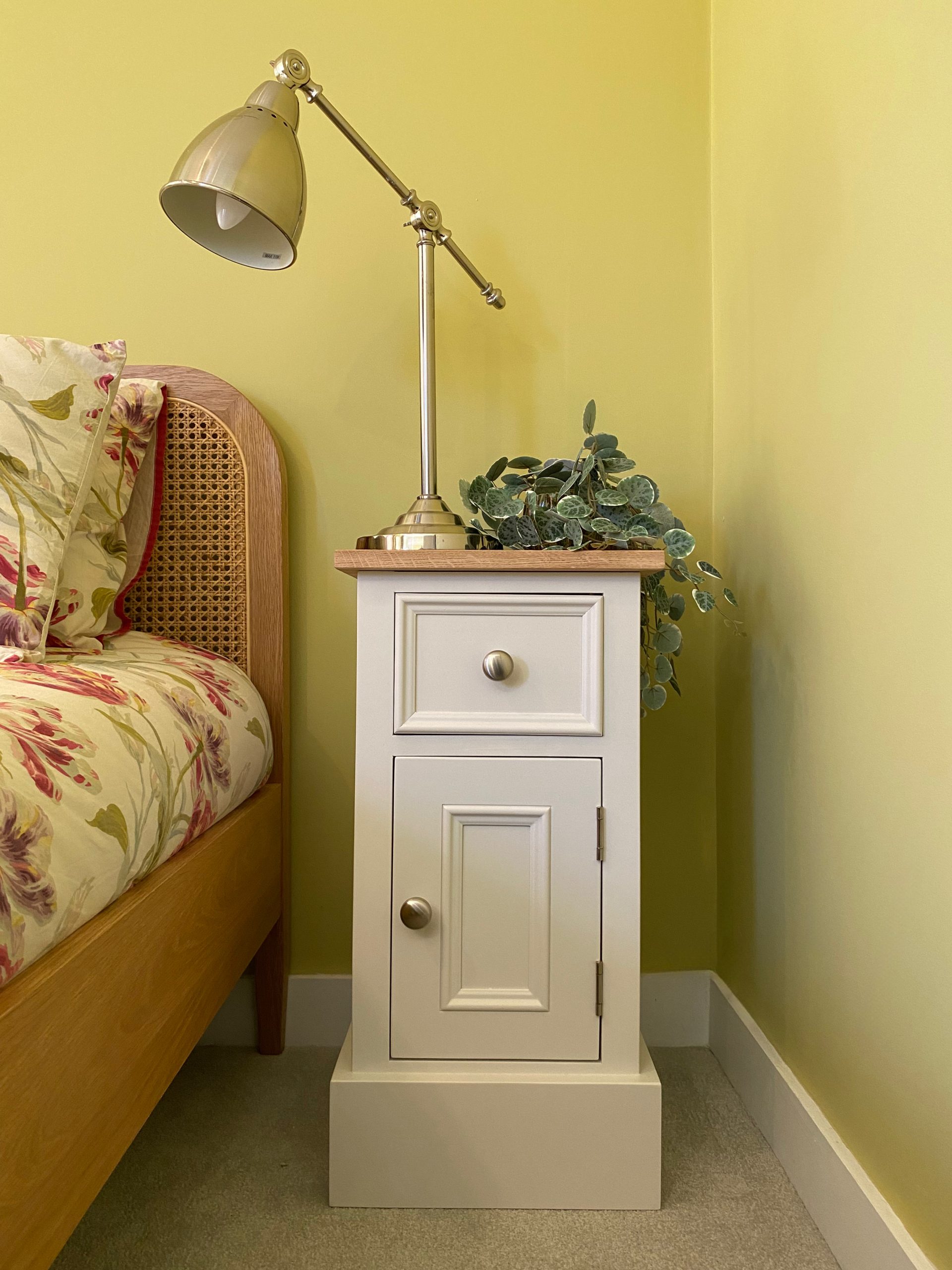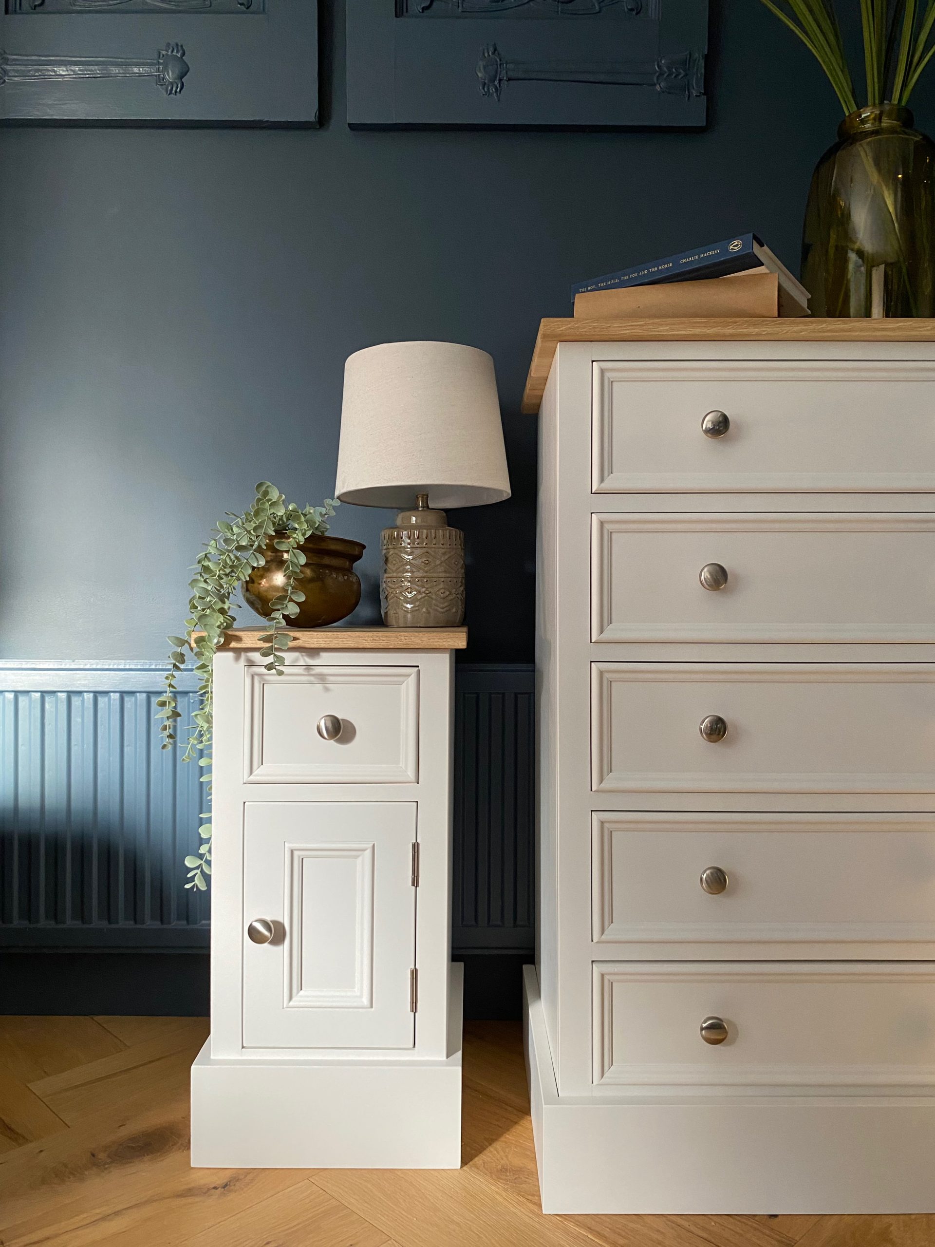 This elegant bedside cupboard takes is design inspiration from typical English antique furniture with a contemporary twist. The bedside table is handmade from solid pine with a solid oak worktop and using age old cabinet making techniques for a unit that will last a lifetime. This bedside cabinet consists of a drawer and door below with a shelf inside and would be painted in any Farrow and Ball colour of your choice. We can also make the bedside cupboard to any width, height or depth and any design, for example just one door or a row of drawers. Also if you wanted plain shaker doors or cockbead, we can accommodate these options too.