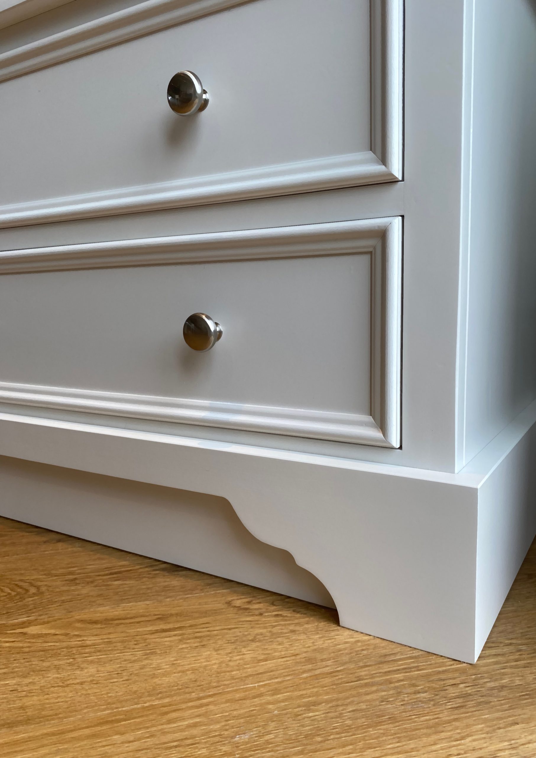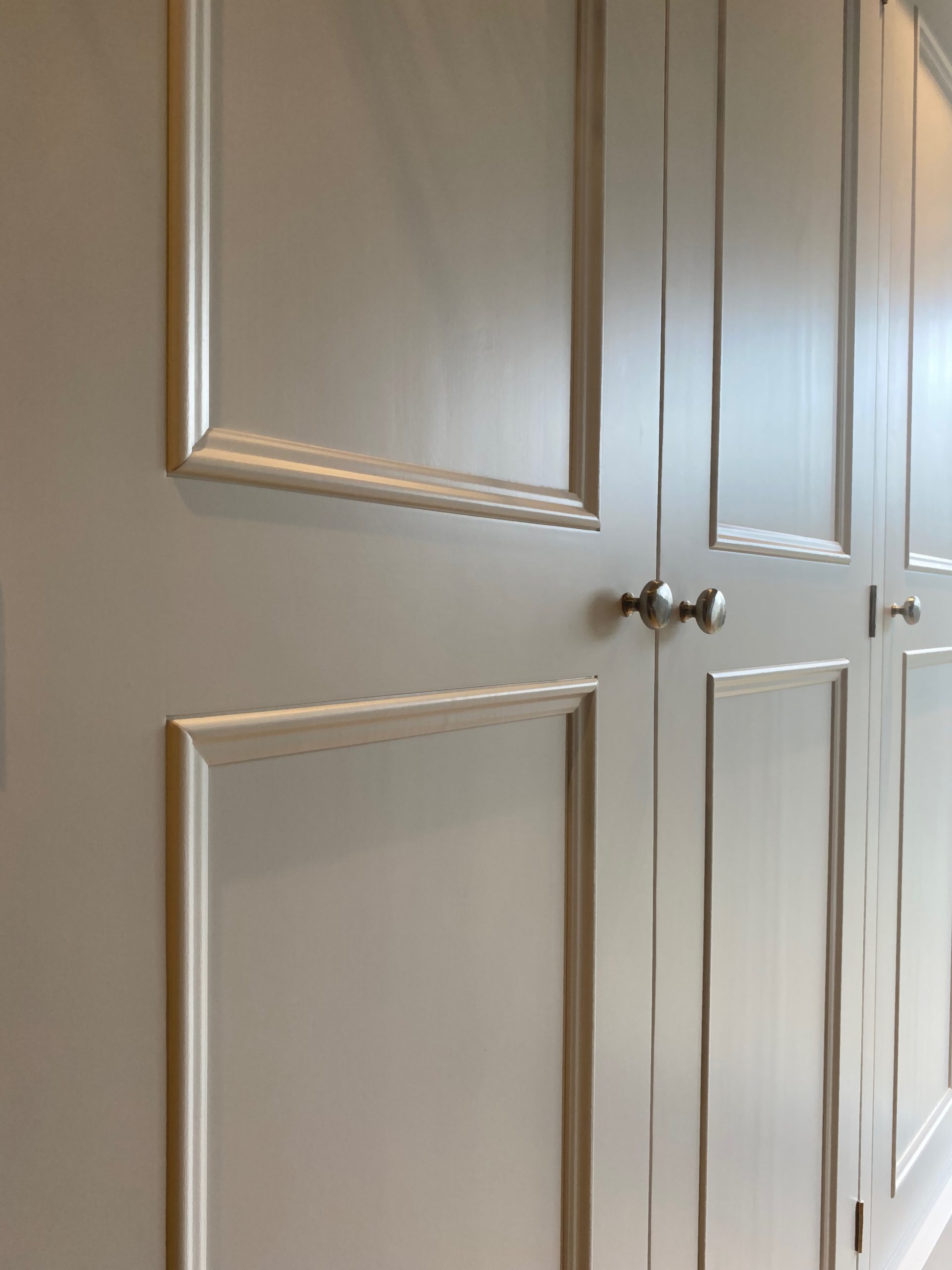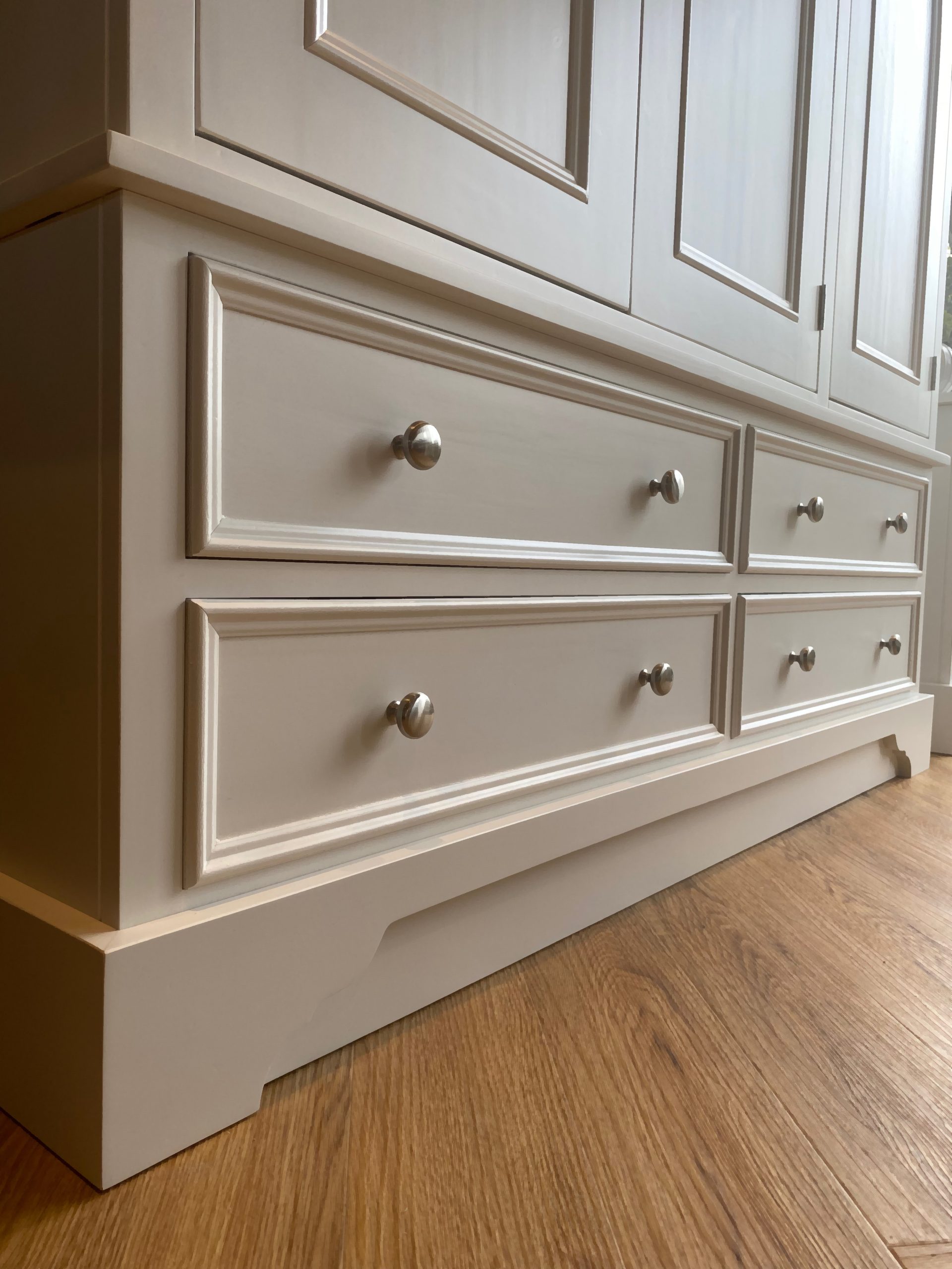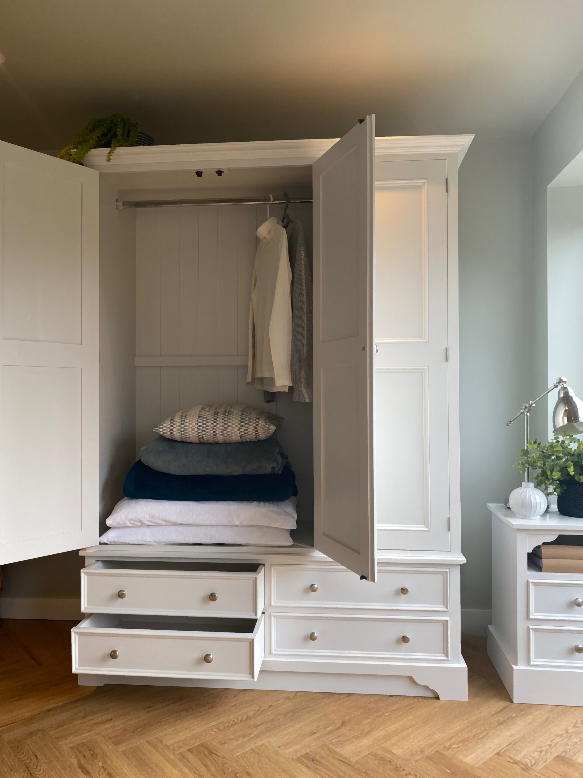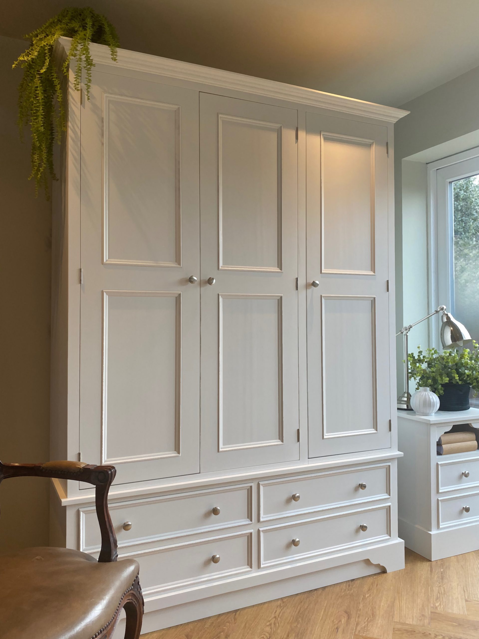 The Carlton triple wardrobe design is inspired by traditional English furniture characteristics, beaded doors and drawers and bracket style feet. Handmade in the UK by skilled craftsmen from solid pine and using tried and tested techniques. A great amount of hanging space with a rail on each side. But of course it can be shelved fully or in part if required. Made in three main sections so that it can be easily transported upstairs. If the Georgian inspired features aren’t quite suitable for your space then we can make it with plain shaker doors and plain plinth. Painted in any Farrow and Ball colour of your choice. We can also make this wardrobe to most size requirements so if you need to change the height, width or depth then drop us an email.