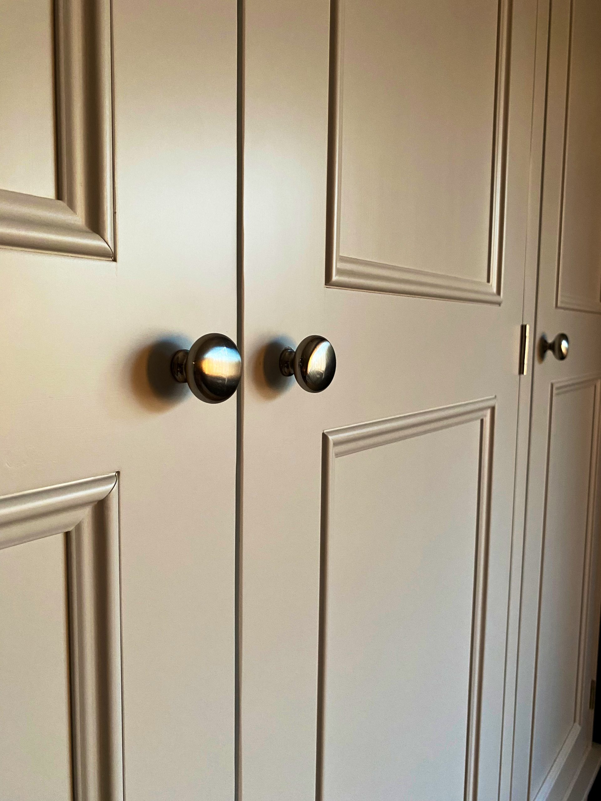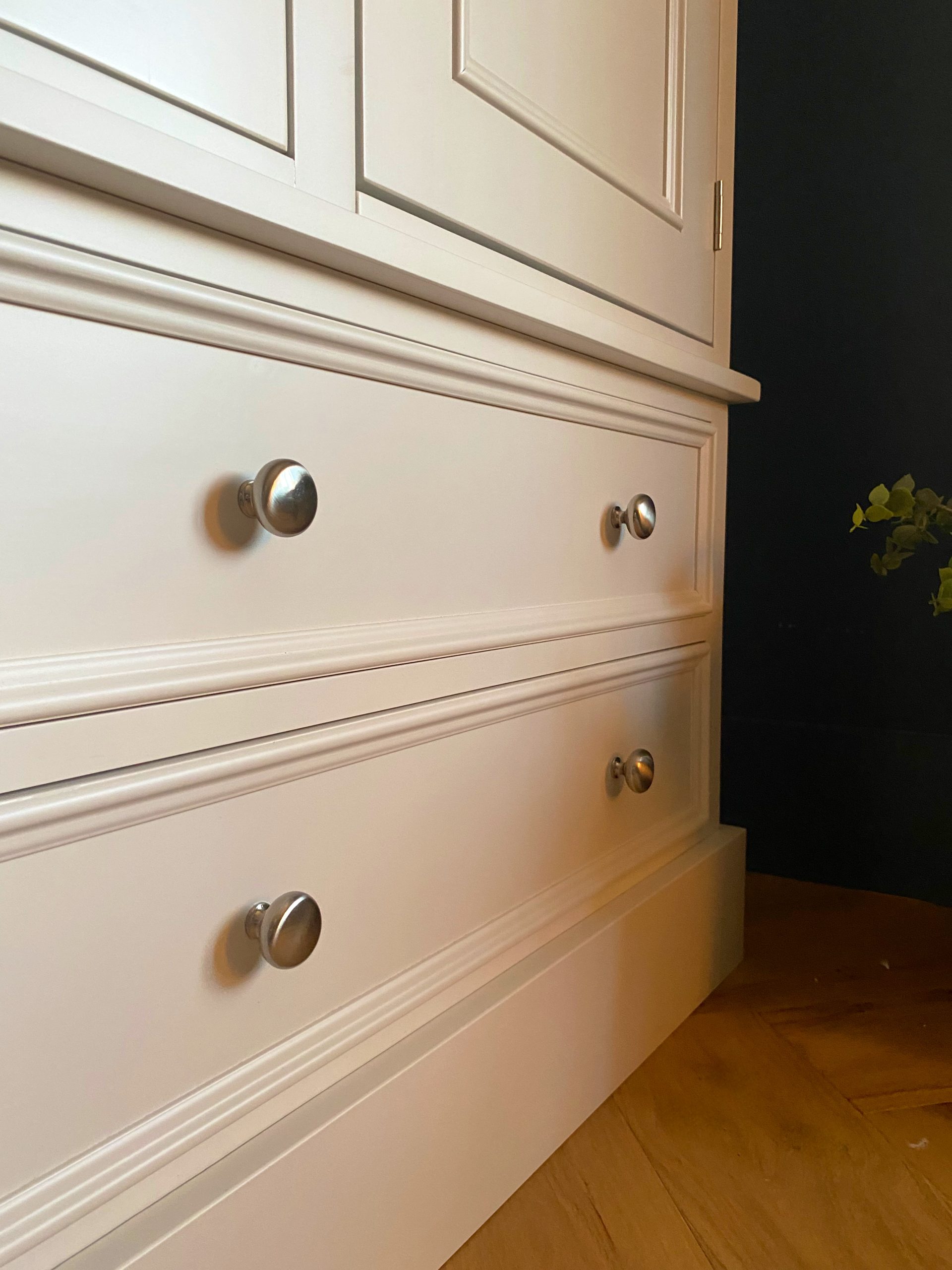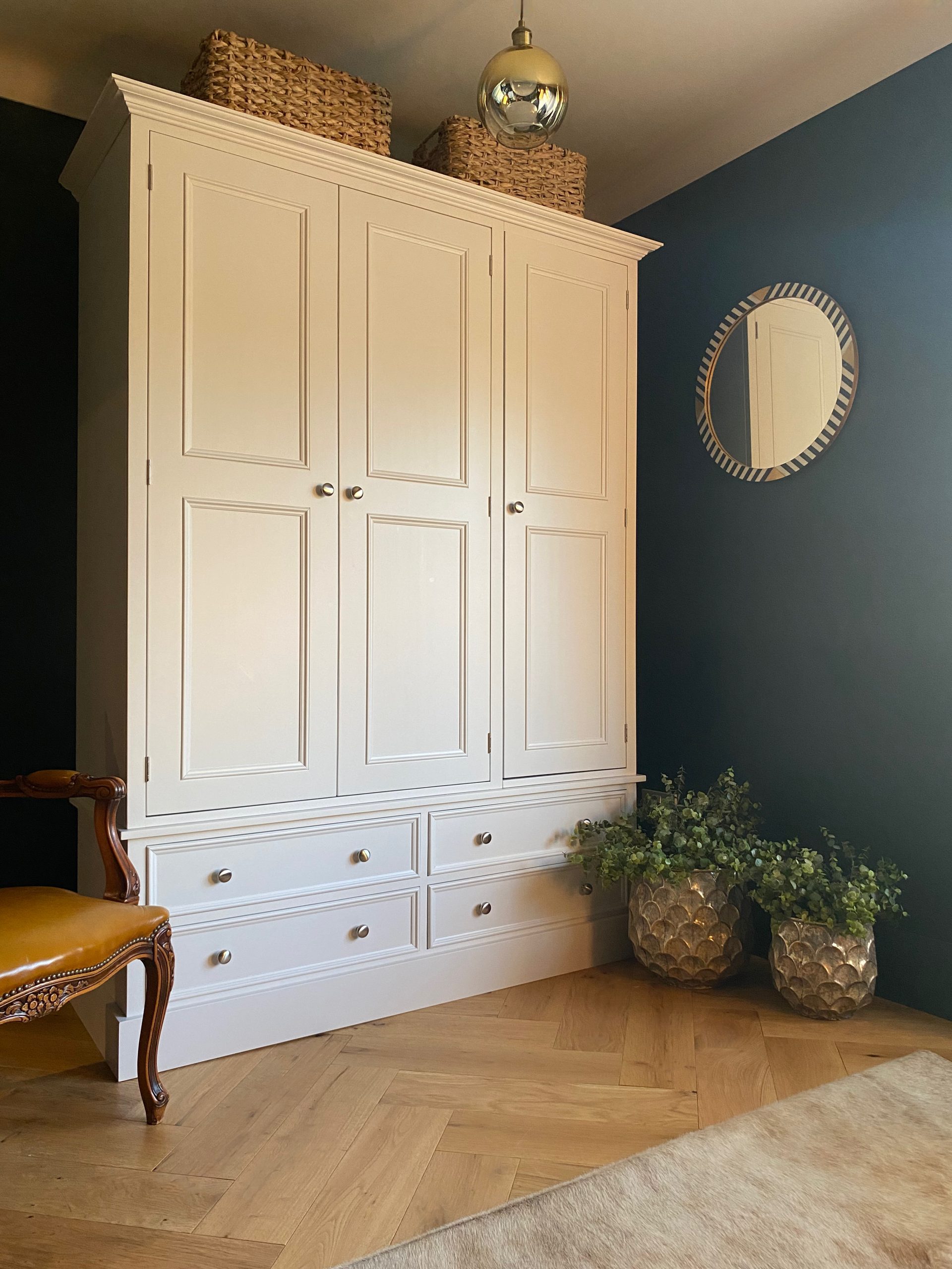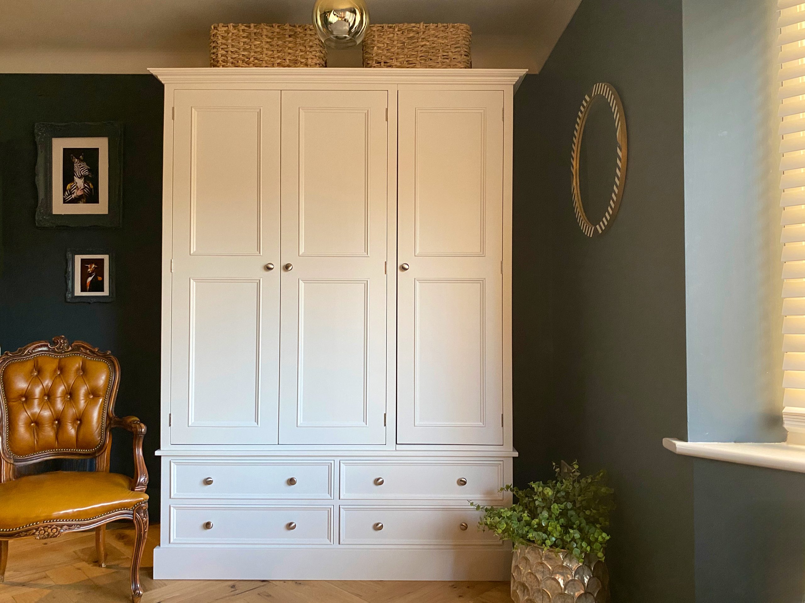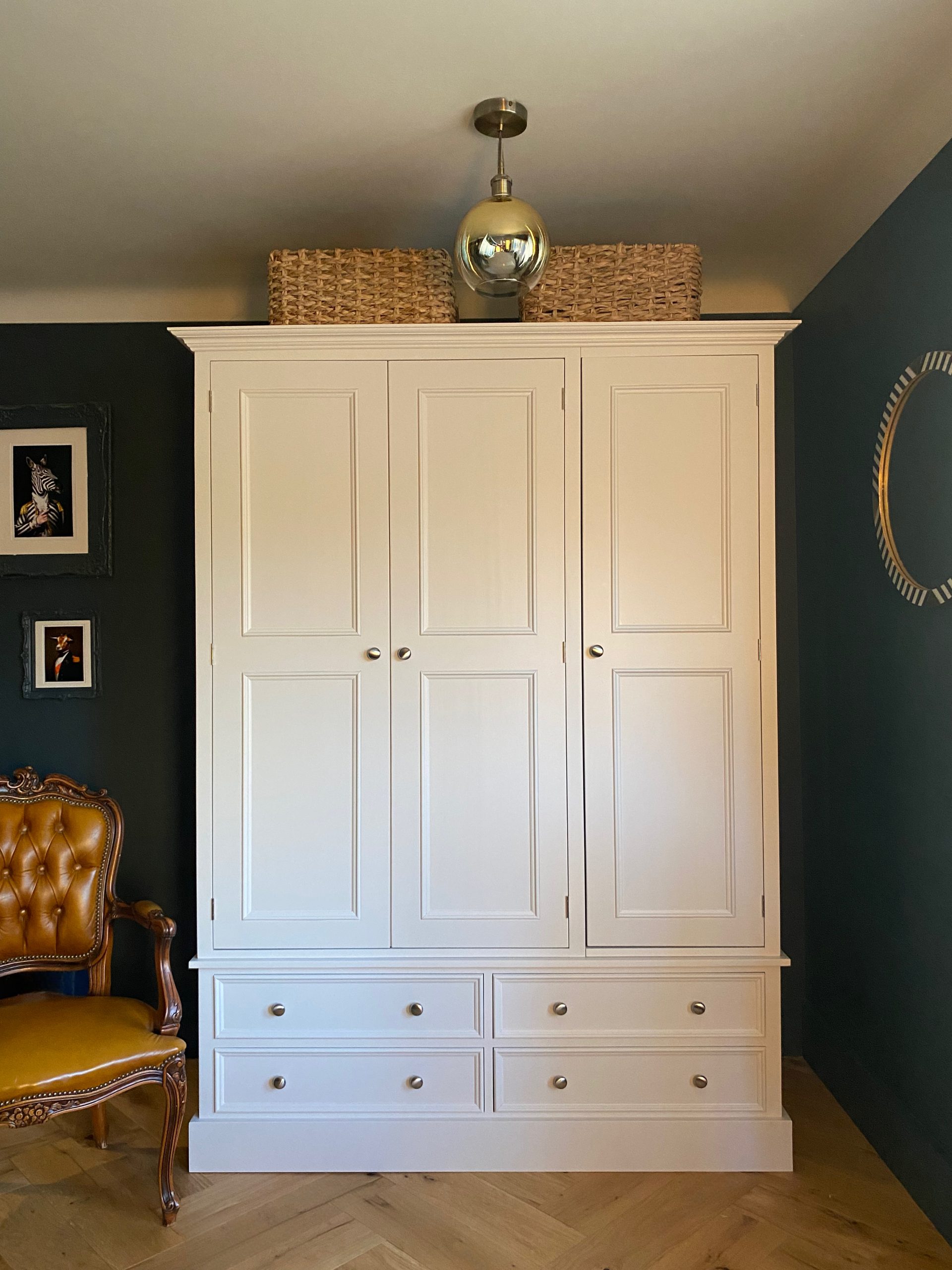 With a subtle and sophisticated design this triple wardrobe has been made here in the UK by skilled cabinet makers who use traditional techniques to construct units that will last a lifetime. A hanging rail inside each part gives a good sized hanging space but if you need some shelves then just let us know. And four drawers below all with dovetail joints. Made in three main sections so that it can be easily transported upstairs. If you’d rather have plain shaker doors instead of the beaded style then that’s no problem, just let us know upon ordering. Choose any Farrow and Ball colour for this beautiful wardrobe to set it perfectly in your interior. We can also make this wardrobe to any size so if you need to alter the height width or depth then drop us an email.