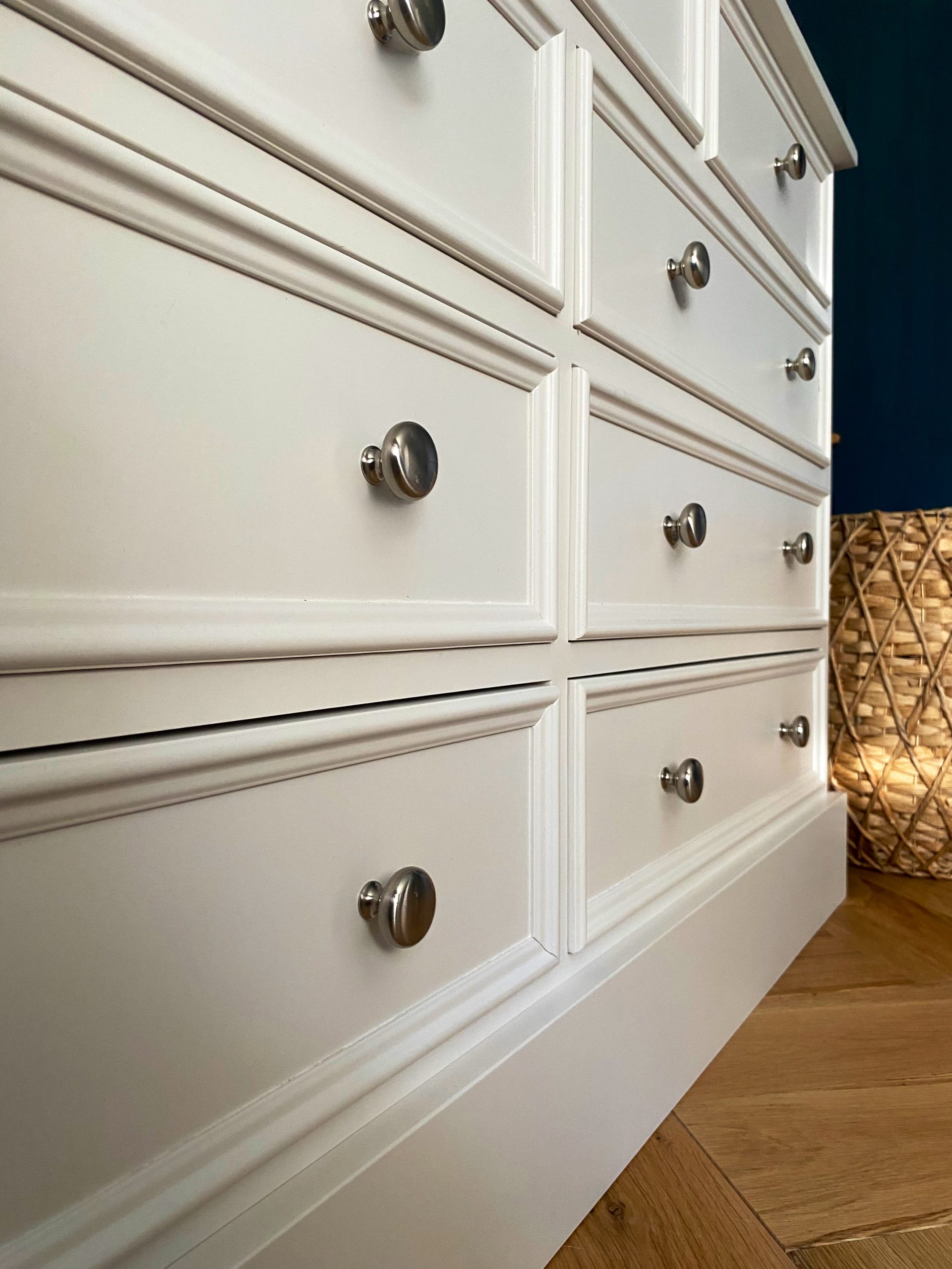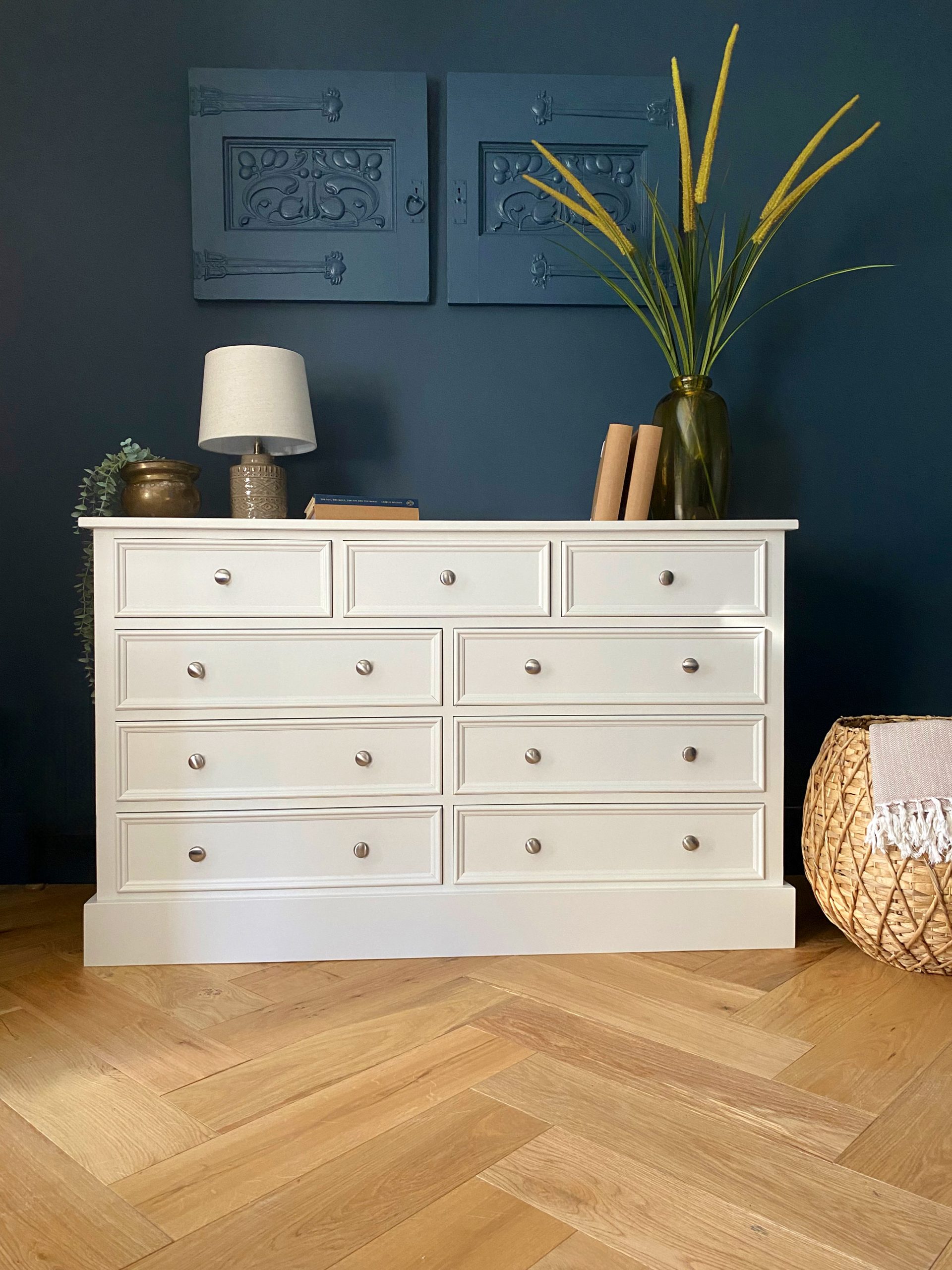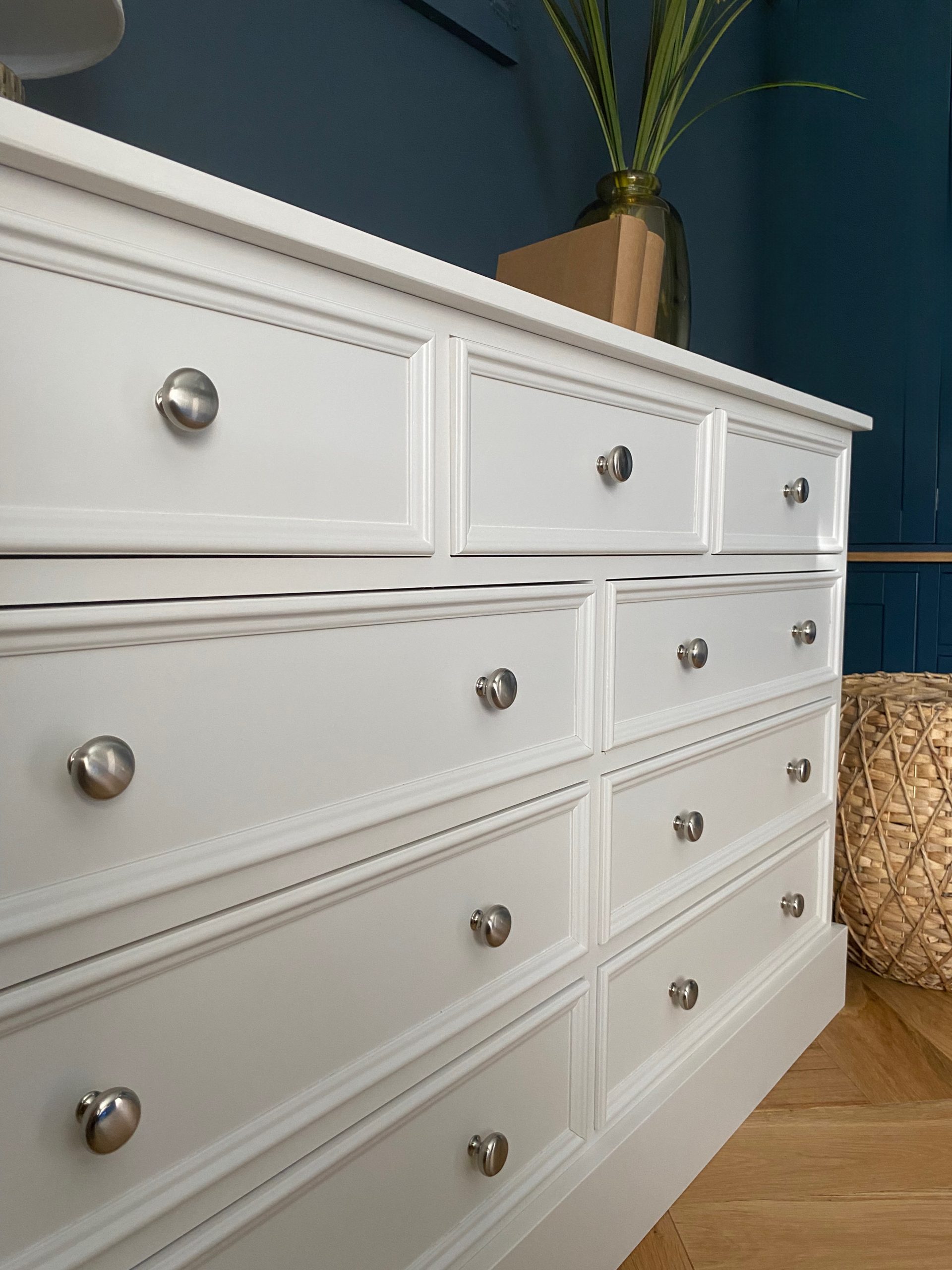A big chest of drawers with loads of functional storage without compromising on style. This chest of drawers is hand crafted from solid pine with a choice of worktop materials. Built to last a lifetime, exquisite quality. Because all our furniture is handmade we can change the design and sizes to suit your requirements, feel free to contact us with your requirements. We can also change the beaded drawers to plain shaker doors if that’s more your style. You can choose any Farrow and Ball colour for the chest of drawers, with a huge selection of colours it’s the perfect way to make your unit stand out from the crowd and work perfectly with your interior.