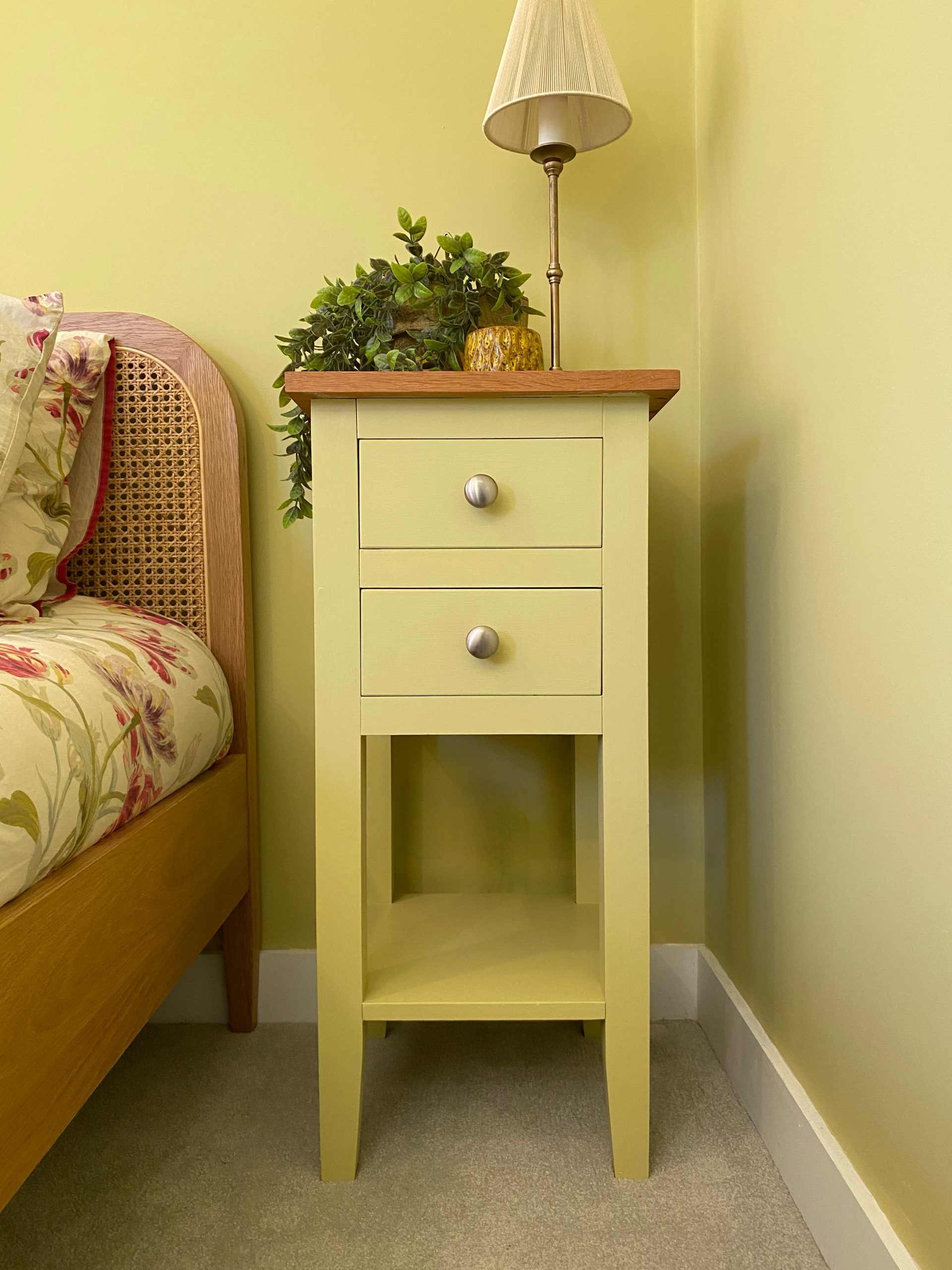 Choose any Farrow and Ball colour for these modern but equally stunning bedside cabinets. Hand crafted in the UK from solid pine and this one has a solid oak worktop but you can also choose a waxed pine or painted worktop. Built using time honoured skills and traditional methods to construct units that are built to last. As all our furniture is handmade, we can make them bigger or smaller to suit your needs or we can change the design for example if you wanted more drawers or a cupboard door.