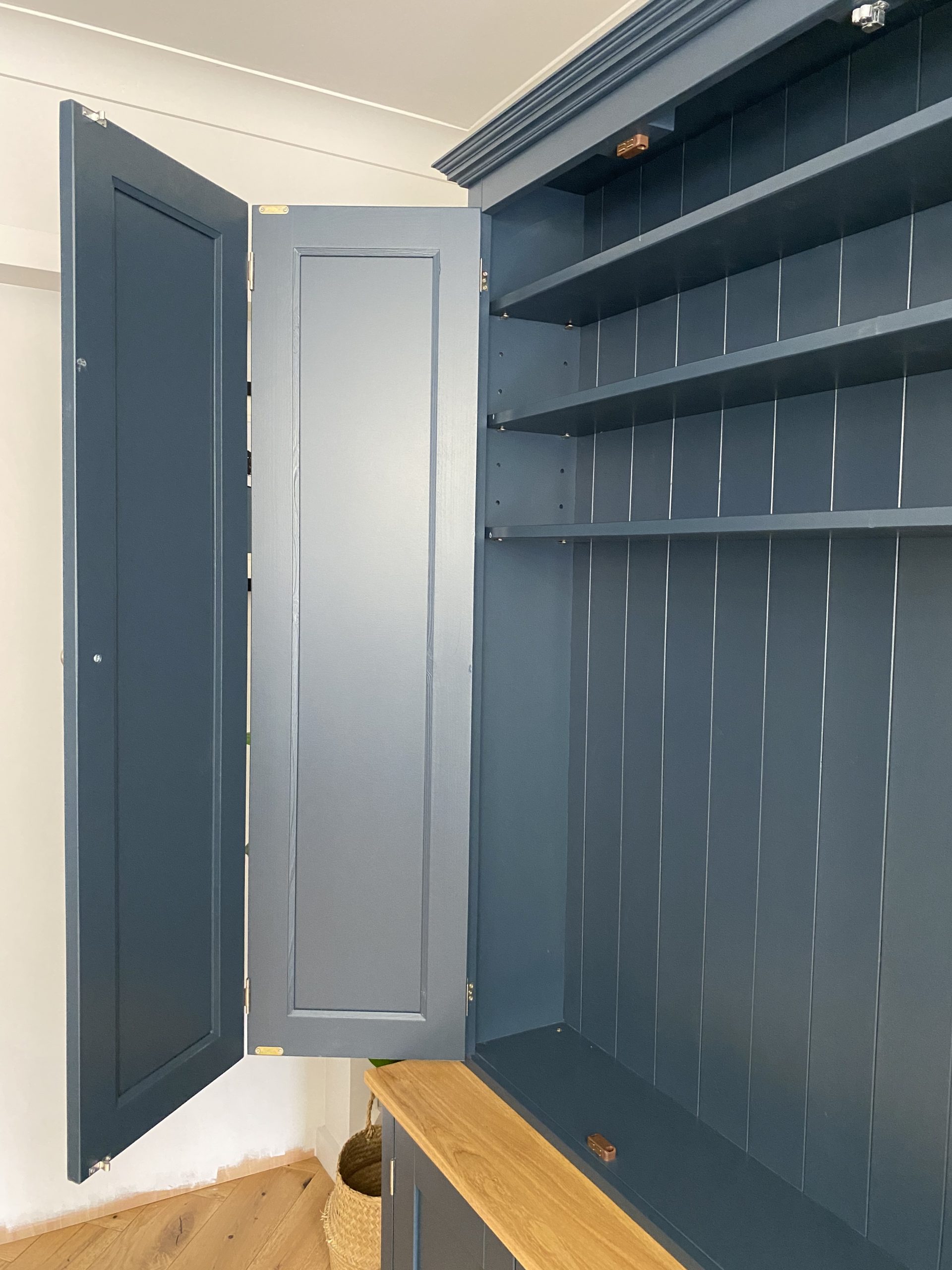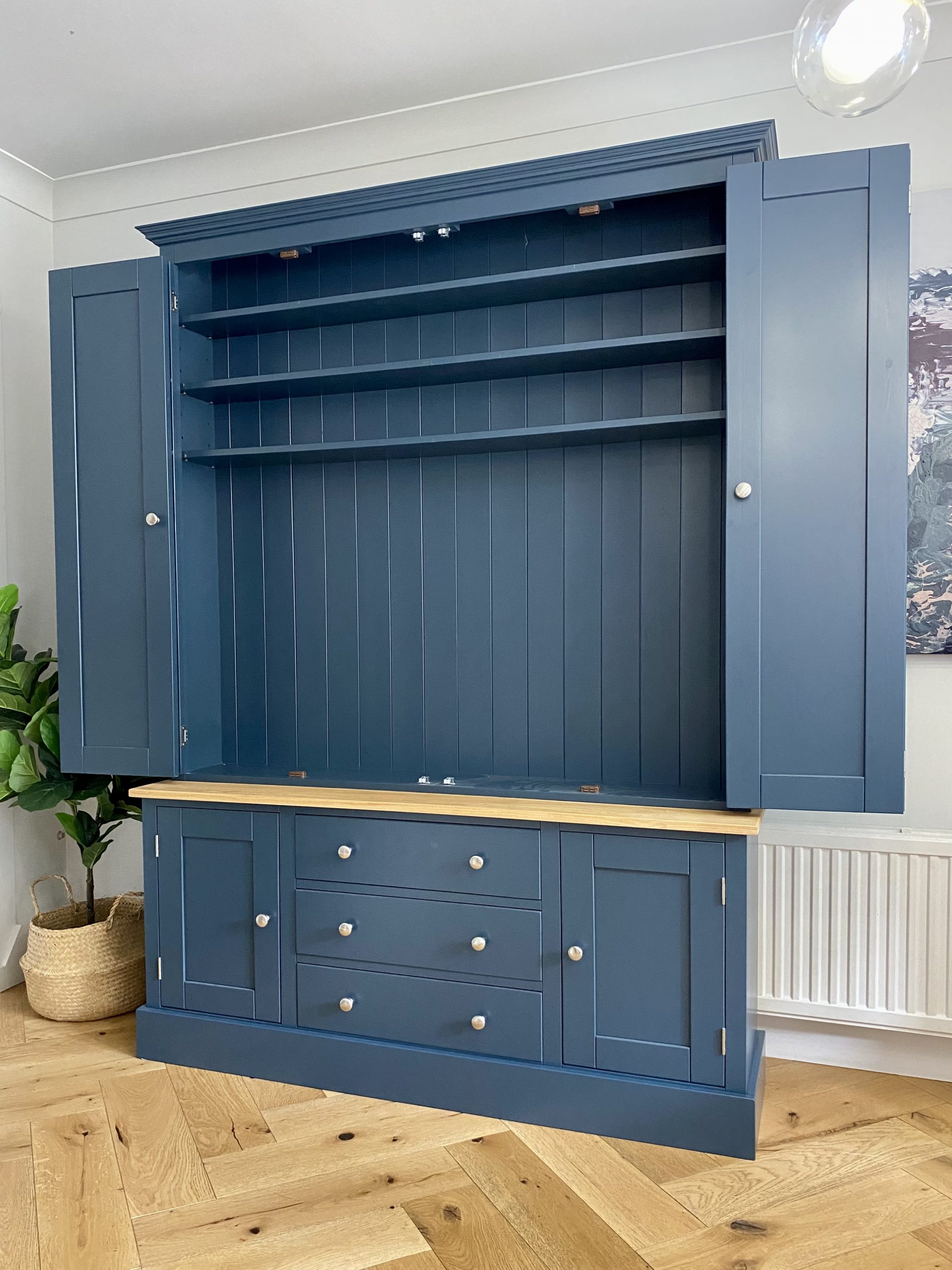 THIS UNITS FANTASTIC BIFOLDING DOORS STYLISHLY CONCEAL YOUR TV AND MEDIA EQUIPMENT WHEN YOU DON’T WANT THEM ON SHOW. A CABLE HOLE ALLOWS ALL YOUR CABLES TO BE HIDDEN BEHIND THE UNIT. AND LOTS OF EXTRA STORAGE IN THE SHELVES, DRAWERS AND CUPBOARD DOORS. HANDCRAFTED IN THE UK USING TRADITIONAL JOINERY TECHNIQUES AND YOU CAN CHOOSE ANY FARROW AND BALL COLOUR TO FINISH.